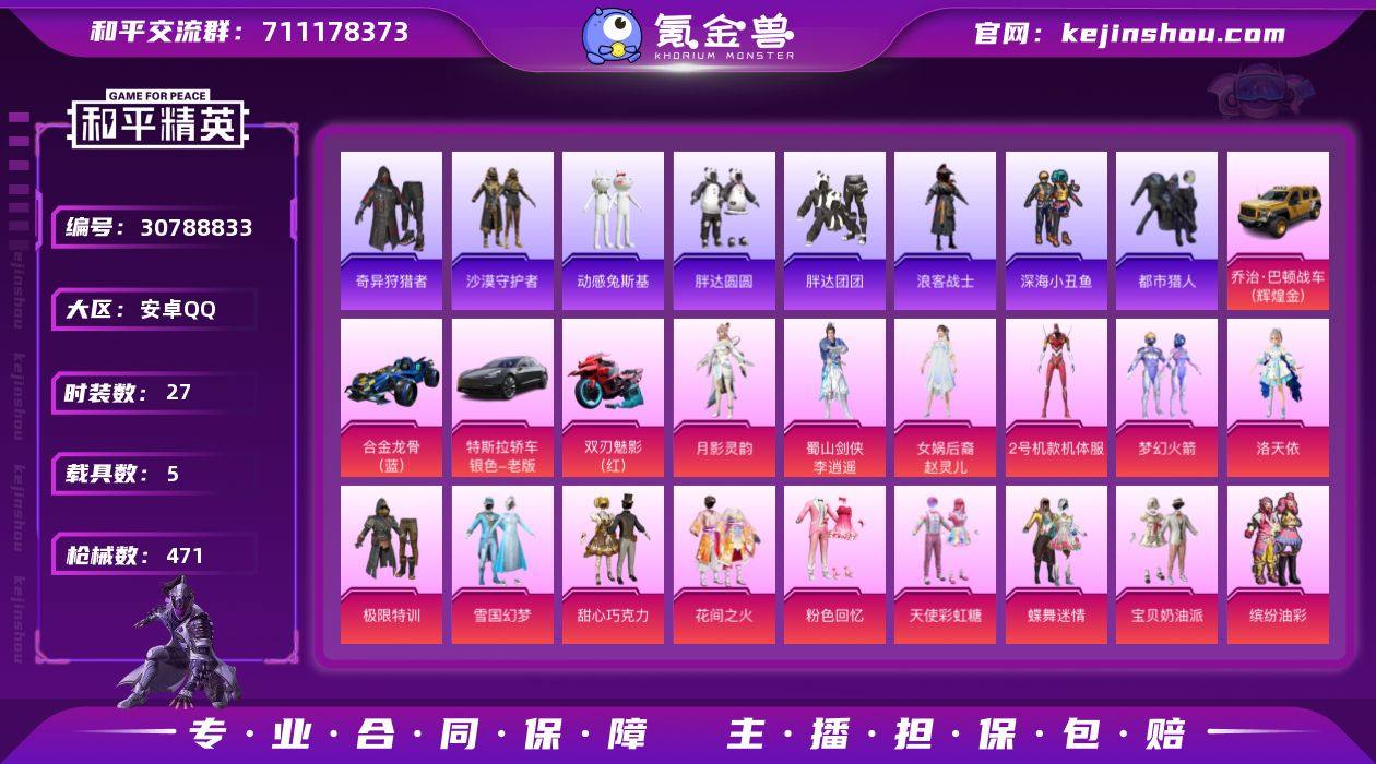 安卓手Q-23王牌印记-有战神框-77粉装-27特效枪-5载具-热力值-432套装-471枪皮-3卓越印记-2传奇印记 【77粉装】,雪国幻梦,梦幻火箭,2号机款机体服,甜心巧克力,宝贝奶油派,天使彩虹糖,千面幻镜,缤纷油彩,放客神游,新星烈龙,灵感创作师,童趣迷兔,女娲后裔-赵灵儿,蝶舞迷情,洛天依,彩虹甜喵,草莓生巧,花间之火,极致幻想,暗夜玫瑰,精灵迷巫,蓝莓炮弹,闲梦青缨,甜蜜誓约,复仇流浪者,甜心娃娃,精灵娃娃,酣梦娃娃,深海曼妙,潮汐统领,橘柚倾心,金属狂野,月影灵韵,智能音符,薄荷物语,海盐物语,星点战士,绒雪飘舞,傲雪凌霜,霁雪冰心,暖熊萌萌,寒光使者,甜梦小狐,天启纪元,太空嘟嘟,妙趣可丽,馨动时刻,垂柳戏鸭,俏皮狐尾,冰川粉黛,冰川幽秘,旋转彩虹,甜蜜草莓,冰霜白皇,炙焰红王,李逍遥,极限特训,金风玉露,锦绣火鲤,彩虹鹿灵,独舞天鹅,山涧鹿灵,青空秋雨,启明星,海螺星光,歌者泠鸢,暗夜鎏金,星夜魔法师,绚金战神,未来歌姬,香水柠檬,蜜桃特工,蝶舞蔷薇,仲夏莫吉托,未来战士,相思残雪,粉色回忆 【27特效枪】AKM-盖世英雄-4级 AKM-甜心宝贝-2级 M16A4-垂柳戏鸭-2级 SCAR-L-纯梦嫁纱-1级 SCAR-L-梦幻火箭-4级 SCAR-L-童趣迷兔-1级 M416-五爪金龙-5级 M416-心之恋语-2级 M416-暖熊萌萌-2级 GROZA-香水柠檬-4级 GROZA-旋转彩虹-1级 AUG-妙趣可丽-4级 M762-甜蜜誓约-7级 Kar98K-巳巳如意-5级 AWM-橘柚倾心-4级 AMR-智耀战神-1级 SKS-诡面斩-4级 SLR-暗夜玫瑰-1级 UZI-筑梦精灵-4级 UMP45-相思残雪-5级 UMP45-恐龙拽拽-1级 Vector-环太平洋-4级 野牛-青空秋雨-4级 P90-甜蜜草莓-4级 M249-彩虹甜喵-4级 DP-28-暗夜鎏金-2级 MG3-洛神天依-6级 【19稀有紫装】,都市猎人,萌熊伴侣背包(3级),奇异狩猎者,暗影哥特,深海小丑鱼,沙漠守护者,浪漫天命,雪山精英,胖达圆圆,浪漫