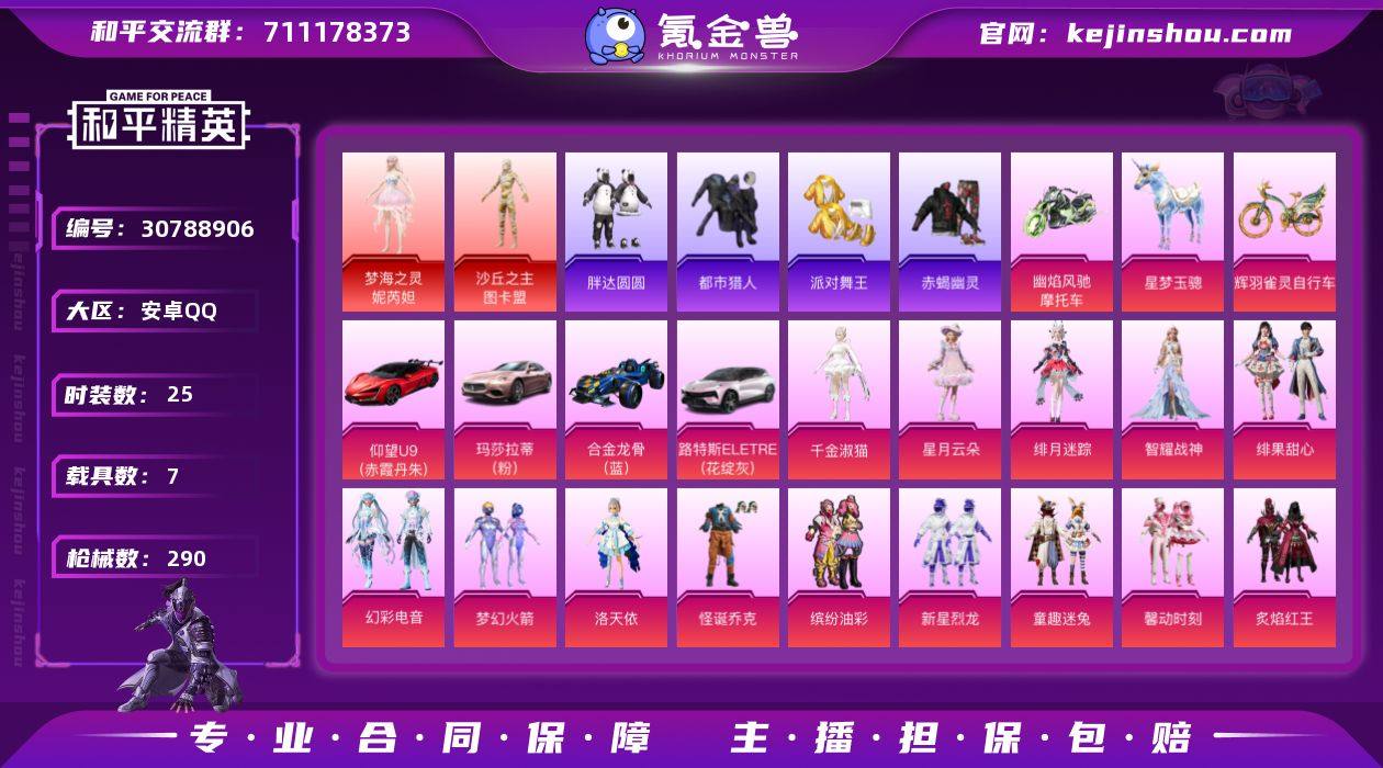 安卓手Q-12王牌印记-32粉装-25特效枪-7载具-热力值-219套装-290枪皮-9卓越印记-2传奇印记 【32粉装】,梦幻火箭,小叽联名款,缤纷油彩,放客神游,新星烈龙,灵感创作师,童趣迷兔,第五大道,洛天依,怪诞乔克,幻彩电音,绯果甜心,绯月迷踪,智耀战神,星月云朵,傲傲奶龙,严莉莉,千金淑猫,小可学妹,美雪,圣堂之誓,暖熊萌萌,寒光使者,莲影清波,馨动时刻,冰川幽秘,冰霜白皇,炙焰红王,瑰丽时代,仲夏莫吉托,烟云彩露,呆萌星弥 【25特效枪】AKM-梦之光华-5级 SCAR-L-童趣迷兔-7级 SCAR-L-锦绣绵绵-5级 M416-心之恋语-5级 M416-墨龙九天-3级 GROZA-焦糖拿铁-4级 AUG-暖羊咩咩-5级 Kar98K-圣域龙灵-3级 Kar98K-巳巳如意-5级 AMR-智耀战神-3级 M200-梦海之灵-3级 Mk14-甜梦熊击-5级 M417-第五大道-1级 UMP45-量子极限-5级 UMP45-宇宙意志-3级 汤姆逊-星月云朵-4级 AKS-74U-星穹咏叹调-1级 AKS-74U-信仰神谕-5级 P90-沙丘之主-3级 DP-28-圣堂之誓-5级 MG3-辉羽雀灵-3级 PKM-江南烟雨-4级 平底锅-仲夏莫吉托-2级 烟雾弹-丁香清露-4级 破片手榴弹-热量炸弹-5级 【2红装】,沙丘之主-图卡盟/4级,梦海之灵-妮芮妲/1级, 【13稀有紫装】,都市猎人,派对舞王,赤蝎幽灵,Mark.06,8号机,暗影哥特,浪漫天命,胖达圆圆,浪漫波比,小丑鱼,龟仙人,临安公主,暗夜魅影, 【7稀有载具】,辉羽雀灵自行车,幽焰风驰摩托车,玛莎拉蒂Ghibli(粉),路特斯ELETRE(花绽灰),仰望U9(赤霞丹朱),合金龙骨(蓝),星梦玉骢, 【2僚机】,僚机-圣域龙宝,空客H135-蔚蓝之翼, 【219稀有时装】,妮芮妲/1级,图卡盟/4级,SS31特训,SS33特训,SS32特训,彩虹兔,蓝冰羽,极速光影,雪绒豹,恋语绒绒,幽澜祭司,星渊小夜曲,星影赞美诗,乐游熊熊,SS34特训,紫幽梦,大橘大利,都市猎人,浪漫天