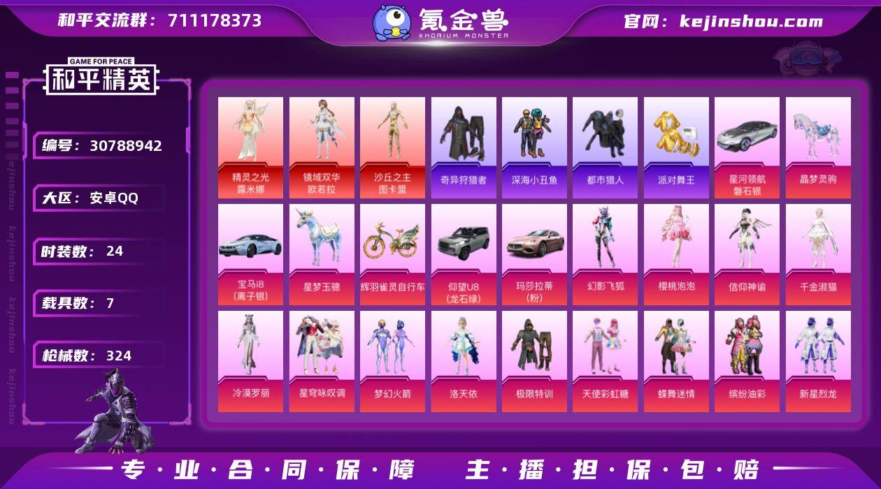 安卓手Q-13王牌印记-34粉装-24特效枪-7载具-热力值-223套装-324枪皮-3卓越印记-0传奇印记 【34粉装】,梦幻火箭,初号机 觉醒Ver.,天使彩虹糖,缤纷油彩,新星烈龙,蝶舞迷情,洛天依,冷漠罗丽,星穹咏叹调,玩偶服-猪猪侠,憨憨奶龙,幻影飞狐,千金淑猫,沙场疾风,阿尔茜,紫钛骑兵,玉鳞金羽,猩猩队长,幻影,星云暗核,炫光之旅,美雪,莲影清波,樱桃泡泡,星梦奇缘,幻情紫藤,极限特训,青葱仙萝,信仰神谕,金丰海韵,创世·救赎,烟云彩露,呆萌星弥,脉冲星 【24特效枪】AKM-绿萝繁花-5级 AKM-幻海仙踪-2级 M16A4-垂柳戏鸭-2级 SCAR-L-锦绣绵绵-5级 M416-墨龙九天-3级 M416-至情至圣-9级 M416-电玩时刻-5级 M416-心之恋语-3级 GROZA-精灵之光-3级 AUG-圣斗士星矢-4级 M762-电糖天使-2级 Kar98K-巳巳如意-5级 Kar98K-未来歌姬-4级 Kar98K-圣域龙灵-3级 M24-镜域双华-3级 SVD-月影灵韵-2级 Mk14-盛世惊鸿-3级 P90-沙丘之主-3级 M249-蓝莓炮弹-4级 DP-28-千金淑猫-5级 DP-28-圣堂之誓-1级 MG3-酷泡奶龙-3级 MG3-辉羽雀灵-3级 破片手榴弹-瓶中星球-4级 【3红装】,镜域双华-欧若拉/2级,沙丘之主-图卡盟/4级,精灵之光-露米娜/2级, 【10稀有紫装】,都市猎人,派对舞王,Mark.06,8号机,奇异狩猎者,暗影哥特,深海小丑鱼,小丑鱼,龟仙人,许七安, 【7稀有载具】,辉羽雀灵自行车,玛莎拉蒂Ghibli(粉),宝马i8(离子银),星河领航(磐石银),仰望U8(龙石绿),星梦玉骢,晶梦灵驹, 【223稀有时装】,图卡盟/4级,露米娜/2级,欧若拉/2级,SS31特训,SS33特训,SS32特训,白辉玉蕊,蓝冰羽,鲛海歌灵,雪绒豹,恋语绒绒,幽澜祭司,星渊小夜曲,星影赞美诗,紫幽梦,大橘大利,六号稻草人,都市猎人,奇异狩猎者,龟仙人,Mark.06,暗影哥特,深海小丑鱼,小丑鱼,8号机,许七安
