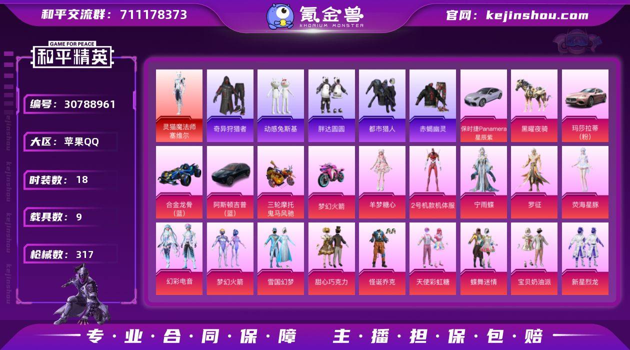 苹果手Q-17王牌印记-21粉装-18特效枪-9载具-热力值-222套装-317枪皮-2卓越印记-1传奇印记 【21粉装】,雪国幻梦,梦幻火箭,2号机款机体服,甜心巧克力,宝贝奶油派,天使彩虹糖,放客神游,新星烈龙,蝶舞迷情,怪诞乔克,幻彩电音,宁雨蝶,罗征,羊梦糖心,荧海星豚,恐龙拽拽,极致幻想,炫光之旅,天禅智恒,炙焰红王,锦绣火鲤 【18特效枪】AKM-炫紫旋律-1级 AKM-甜心宝贝-6级 SCAR-L-梦幻火箭-4级 SCAR-L-童趣迷兔-2级 M416-五爪金龙-1级 M416-心之恋语-1级 M416-灵猫魔法师-6级 GROZA-焦糖拿铁-5级 AUG-圣斗士星矢-1级 AUG-星之彼岸-5级 M762-甜蜜誓约-5级 Kar98K-巳巳如意-5级 AWM-花间之火-4级 P90-仙履奇缘-4级 DP-28-豹影疾电-1级 MG3-梦幻舞会-4级 撬棍-永恒法杖-3级 平底锅-喜羊羊与灰太狼-2级 【1红装】,灵猫魔法师-塞维尔/1级, 【12稀有紫装】,都市猎人,赤蝎幽灵,萌熊伴侣背包(3级),奇异狩猎者,暗影哥特,浪漫天命,胖达圆圆,龟仙人,暗夜魅影,金羽特工,萌熊伴侣背包(2级),零款战斗服, 【9稀有载具】,黑曜夜骑,保时捷Panamera(星辰紫),玛莎拉蒂Quattroporte(幻星粉)/5级,迈凯伦570S(镭射紫)/1级,玛莎拉蒂Ghibli(粉),阿斯顿·马丁DBX(蓝),合金龙骨(蓝),双人摩托-梦幻火箭,鬼马风驰, 【223稀有时装】,塞维尔/1级,哪吒/2级,SS31特训,SS33特训,SS32特训,彩虹兔,蓝冰羽,时希公主,雪绒豹,恋语绒绒,星渊小夜曲,星影赞美诗,SS34特训,朱霞炽焰,紫幽梦,夜瞳黯灵,喜羊羊,都市猎人,浪漫天命,暗夜魅影,奇异狩猎者,龟仙人,暗影哥特,懒羊羊,美羊羊,金羽特工,零款战斗服,胖达圆圆,赤蝎幽灵,凌霄紫焰,擎苍青焰,蜜露汐语,薄荷星砂,粉恋花,云朵鹅,顶瓜瓜,西部牛仔,激萌罗小黑,大橘为重,动感兔斯基人偶服,银碳小老虎,狂沙舞者,潮萌小黄鸭,黑色高级特训官上衣,异域银装