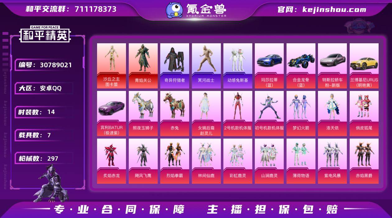 安卓手Q-24王牌印记-36粉装-14特效枪-7载具-热力值-237套装-297枪皮-3卓越印记-1传奇印记 【36粉装】,梦幻火箭,初号机款机体服,2号机款机体服,女娲后裔-赵灵儿,洛天依,白勺歌姬,炙焰赤龙,飓风飞鹰,暗夜玫瑰,闲梦青缨,阿尔茜,茉莉星,复仇流浪者,绚丽摇曳,幻梦音符,闪耀律动,星云暗核,宙之时溯,薄荷物语,赤焰黑爵,冷魅冰骑,紫电风暴,绒雪飘舞,傲雪凌霜,霁雪冰心,圣光天使,霞光圣骑,寒光使者,妙趣可丽,俏皮狐尾,林间仙鹿,彩虹鹿灵,山涧鹿灵,星夜魔法师,烈焰拳霸,呆萌星弥 【14特效枪】AKM-梦之光华-7级 SCAR-L-桃夭倾城-2级 SCAR-L-万古烈焰-9级 M416-超新星-9级 M416-心之恋语-2级 AUG-南国舞曲-5级 Kar98K-巳巳如意-5级 AMR-炫光之旅-5级 Mini14-荧光虫舞-5级 P90-粉樱探戈-6级 P90-沙丘之主-3级 M249-绒雪飘舞-5级 DP-28-豹影疾电-5级 MG3-洛神天依-5级 【2红装】,沙丘之主-图卡盟/3级,角色-青焰关公/1级, 【13稀有紫装】,冥河战士,萌熊伴侣背包(3级),奇异狩猎者,浪漫天命,雪山精英,明日香款战斗服,小丑鱼,龟仙人,暗夜魅影,萌熊伴侣背包(2级),零款战斗服,真理款战斗服,真嗣款战斗服, 【7稀有载具】,玛莎拉蒂Ghibli(蓝),特斯拉Roadster(沁心粉),兰博基尼URUS(明艳黄),宾利BATTUR(极速紫),合金龙骨(蓝),赤兔,照夜玉狮子, 【237稀有时装】,赵灵儿,青焰关公/1级,图卡盟/3级,SS31特训,SS33特训,SS32特训,极速光影,恋语绒绒,SS34特训,大橘大利,浪漫天命,暗夜魅影,奇异狩猎者,龟仙人,雪山精英,小丑鱼,零款战斗服,明日香款战斗服,真理款战斗服,真嗣款战斗服,冥河战士,顶瓜瓜,动感兔斯基人偶服,Alan Walker,异域银装,都市丽猫,白糯汤圆,街头风暴,星途旅人,SS30特训,战术大师,智谋强哥,香桃花海,蝶变,元素星魂,SS28特训,机械英豪,机械征服者,SS29特训