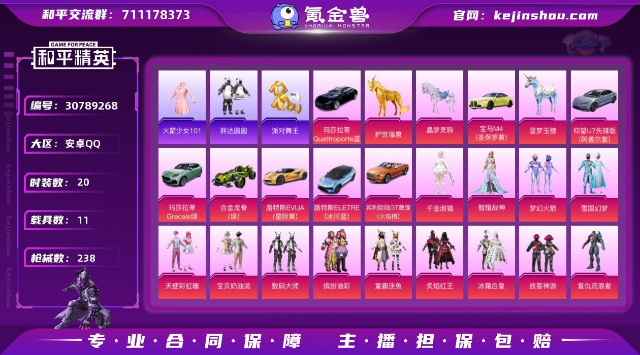安卓手Q-12王牌印记-18粉装-20特效枪-11载具-热力值-157套装-238枪皮-7卓越印记-3传奇印记 【18粉装】,雪国幻梦,梦幻火箭,宝贝奶油派,天使彩虹糖,小叽联名款,缤纷油彩,放客神游,童趣迷兔,第五大道,智耀战神,千金淑猫,复仇流浪者,圣堂之誓,莲影清波,冰霜白皇,炙焰红王,数码大师,烟云彩露 【20特效枪】AKM-甜心宝贝-7级 SCAR-L-金蛇镇世-3级 SCAR-L-童趣迷兔-5级 M416-墨龙九天-3级 M416-心之恋语-5级 M416-暖熊萌萌-1级 GROZA-镜光银凌-5级 AUG-暖羊咩咩-5级 M762-甜蜜誓约-2级 Kar98K-巳巳如意-5级 M24-镜域双华-1级 AWM-天使羽翼-2级 M417-第五大道-5级 UMP45-雪国精灵-7级 Vector-环太平洋-1级 AKS-74U-信仰神谕-5级 P90-沙丘之主-3级 DP-28-千金淑猫-3级 PKM-江南烟雨-5级 烟雾弹-猫咪绅士-5级 【11稀有紫装】,派对舞王,Mark.06,萌熊伴侣背包(3级),暗影哥特,浪漫天命,雪山精英,胖达圆圆,龟仙人,暗夜魅影,巡查衣,萌熊伴侣背包(2级), 【1热门】,火箭少女101, 【2红装】,镜域双华-欧若拉/1级,沙丘之主-图卡盟/3级, 【11稀有载具】,仰望U7先锋版(阿盖尔紫),玛莎拉蒂Quattroporte(夜幕蓝),宝马M4(圣保罗黄),玛莎拉蒂Grecale(薄荷绿),路特斯ELETRE(冰川蓝),路特斯EVIJA(星际黄),宾利欧陆GT敞篷(火焰橘),合金龙骨(绿),护世瑞兽,星梦玉骢,晶梦灵驹, 【1僚机】,空客H135-蔚蓝之翼, 【159稀有时装】,火箭少女101,绝对防御上衣,图卡盟/3级,欧若拉/1级,蓝冰羽,恋语绒绒,紫幽梦,大橘大利,浪漫天命,暗夜魅影,龟仙人,Mark.06,雪山精英,暗影哥特,胖达圆圆,粉恋花,风舞幻音,派对舞王, 暗影刺翼,激萌罗小黑,潮萌小黄鸭,Alan Walker,粉雾星云,黑色高级特训官上衣,晶灵使者,龙魂突击队,卖崽青蛙,小熊娃娃,异