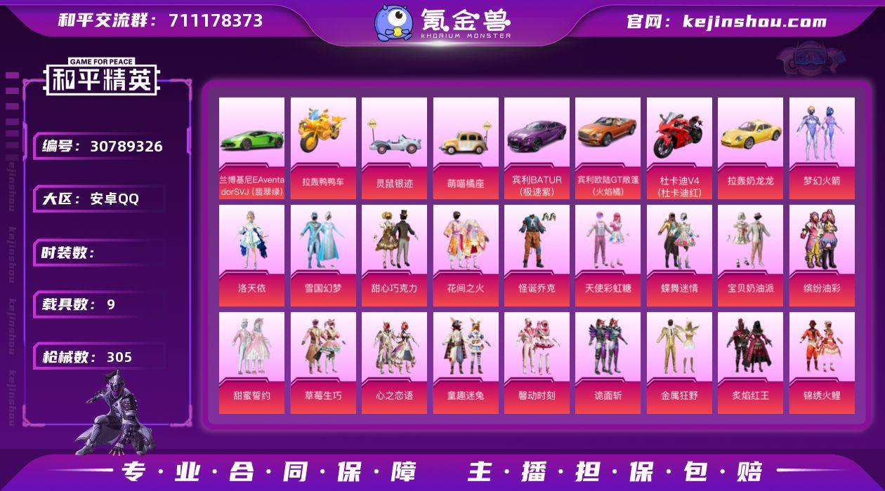 安卓 手Q-81粉装-18特效枪-9载具-热力值-13印记-305套装-305枪皮 1卓越印记 【9载具】布加迪威龙(星云粉)(1级) 拉轰奶龙龙 萌喵橘座 兰博基尼Aventador SVJ(翡翠绿) 宾利BATUR(极速紫) 宾利欧陆GT敞篷(火焰橘) 灵鼠银迹 杜卡迪 Panigale V4(杜卡迪红) 拉轰鸭鸭车 【81粉装】金属狂野套装 妙趣可丽套装 闪耀律动套装 赤焰黑爵套装 小可学妹角色 蝶舞迷情套装 碧蓝澄空套装 山涧鹿灵套装 仲夏莫吉托套装 独舞天鹅套装 雪国幻梦套装 怪诞乔克套装 虎啸骄阳套装 缤纷油彩套装 白勺歌姬角色 飒粉甜心套装 冰川粉黛套装 冰川红玫套装 桃夭倾城套装 吟月归客套装 甜蜜草莓套装 蜜桃特工套装 幻梦音符套装 第五大道套装 瑰丽时代套装 精灵娃娃套装 绿野邂逅套装 彩虹甜喵套装 萌物绒绒套装 冰霜白皇套装 焦糖拿铁套装 挚爱序曲套装 炙焰红王套装 璀璨巨星套装 室女星神套装 甜蜜誓约套装 精灵迷巫套装 宝贝奶油派套装 黄族统领套装 绚金瑰梦套装 霞光圣骑套装 寒光使者套装 天使彩虹糖套装 迷蝶贵族套装 小叽联名款角色 复仇流浪者 心之恋语套装 冰川幽秘套装 绚丽摇曳套装 诡面斩套装 双面双生套装 童趣迷兔套装 黄伞悠悠套装 紫电风暴套装 彩虹鹿灵套装 极致幻想套装 南国舞曲套装 傲傲奶龙套装 暖熊萌萌套装 心之回忆套装 甜心巧克力套装 锦绣火鲤套装 馨动时刻套装 纯珍童话套装 放客神游套装 射星猎手套装 冷魅冰骑套装 骨龙祭渊套装 炙焰赤龙套装 猪猪侠玩偶服 洛天依角色 梦幻火箭套装 圣光天使套装 呆萌星弥角色 花间之火套装 飓风飞鹰套装 灵感创作师套装 暗夜玫瑰套装 草莓生巧套装 林间仙鹿套装 黑伞漫漫套装 【18特效枪】AKM-梦之光华-5级 SCAR-L-纯梦嫁纱-4级 SCAR-L-桃夭倾城-1级 M416-心之恋语-5级 GROZA-超新星-4级 AUG-星之彼岸-6级 M762-甜蜜誓约-7级 Kar98K-伏魔团-2级 M24-莲影清波-2级 AWM-璀璨巨...