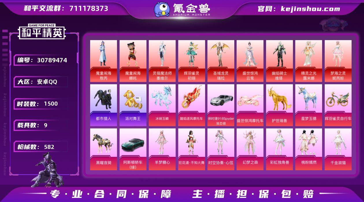 安卓手Q-22王牌印记-有战神框-9红装-55粉装-51特效枪-9载具-热力值-405套装-582枪皮-3卓越印记-1传奇印记 【9红装】幽焰骑士-维塔/1级,魔童闹海-敖丙/1级,梦海之灵-妮芮妲/1级,灵猫魔法师-塞维尔/1级,辉羽雀灵-初翊/1级,圣域龙灵-瑞拉/1级,精灵之光-露米娜/6级,盛世惊鸿-云鸾/1级,魔童闹海-哪吒/1级 【55粉装】套装-蝶舞迷情,角色-羊梦糖心,套装-甜心巧克力,套装-幻梦之森,套装-绚金瑰梦,角色-守护天翼,套装-桃粉嫣然,角色-初号机 觉醒Ver.,套装-金丰海韵,套装-湮灭星辰,套装-绚丽摇曳,套装-仲夏莫吉托,套装-精灵娃娃,套装-缤纷油彩,角色-千金淑猫,角色-彩虹独角兽,套装-星穹咏叹调,套装-极限特训,角色-狂魅哈莉,套装-甜心娃娃,套装-极致幻想,套装-焦糖拿铁,套装-幻彩电音,角色-呆萌星弥,套装-花间之火,角色-冷漠罗丽,角色-狂魇小丑,套装-垂柳戏鸭,套装-锦绣火鲤,套装-俏皮狐尾,时空协奏·心弦,套装-飒粉甜心,套装-恐龙拽拽,套装-御兔特攻,套装-酣梦娃娃,角色-白勺歌姬,套装-宝贝奶油派,角色-荧海星豚,套装-金风玉露,套装-山涧鹿灵,套装-雪国幻梦,角色-洛天依,角色-小可学妹,套装-放客神游,套装-彩虹鹿灵,角色-星梦奇缘,套装-天使彩虹糖,角色-狂花道·不知火舞,套装-纯珍童话,套装-冰霜白皇,角色-时光之誓,套装-未来歌姬,套装-梦幻火箭,套装-星月云朵,套装-黑伞漫漫 【51特效枪】MG-36-幻梦之森/5级,SCAR-L-魔童闹海 哪吒/3级,AKS-74U-星穹咏叹调/5级,M416-女娲灵识/1级,M416-墨龙九天/1级,Kar98K-巳巳如意/5级,M416-五爪金龙/1级,Vector-红伞翩翩/1级,AWM-湮灭星辰/5级,AMR-炫光之旅/4级,MG3-辉羽雀灵/3级,Famas-初号机 觉醒Ver./1级,DP-28-幻梦音符/5级,M416-灵猫魔法师/7级,M24-镜域双华/3级,ARX-无垠阁/5级,Mk14-盛世惊鸿/3级,P90-甜蜜草莓/5级,