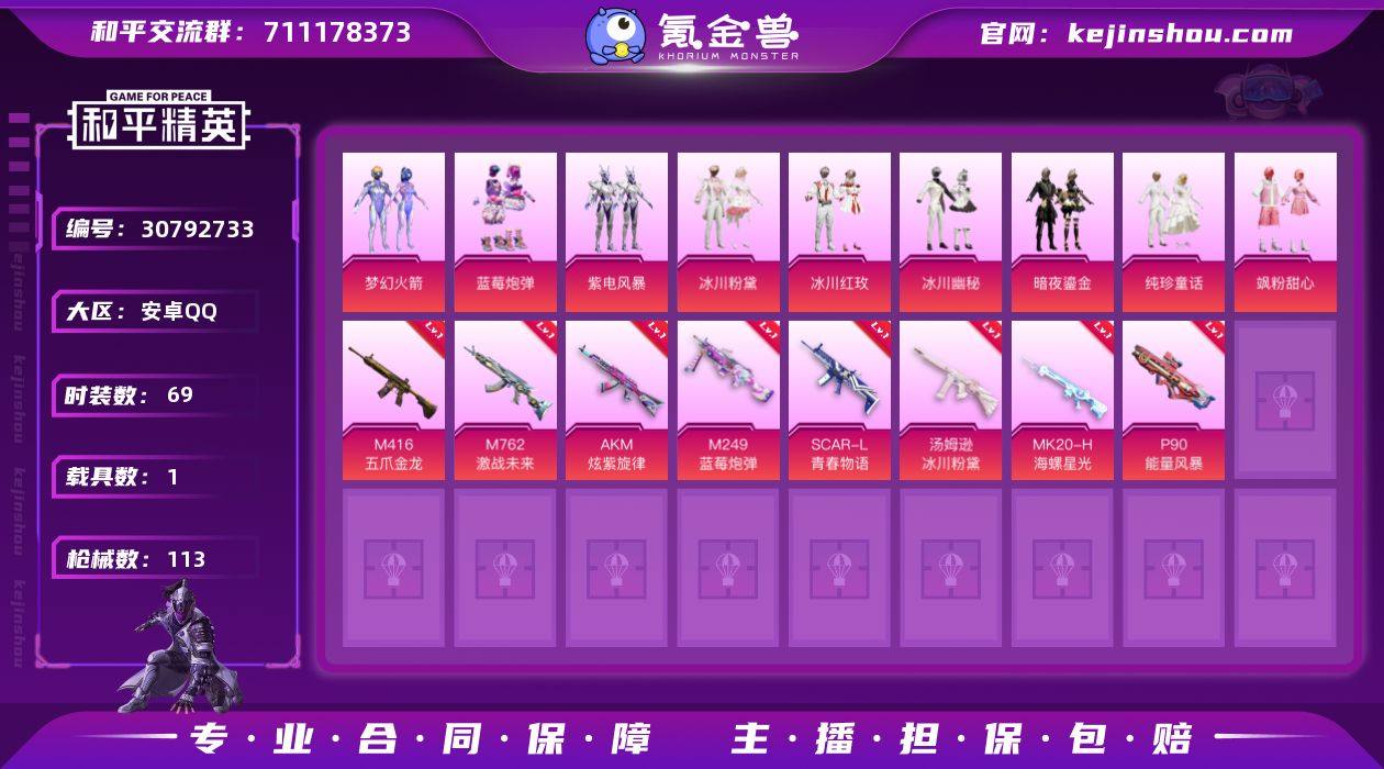 9粉装 9粉枪 1载具 69套装 113枪皮 梦幻火箭 冰川粉黛 冰川红玫 蓝莓炮弹 紫电风暴 纯珍童话 暗夜鎏金 飒粉甜心 冰川幽秘 M416-五爪金龙 AKM-炫紫旋律 SCAR-L-青春物语 汤姆逊-冰川粉黛 MK20-H-海螺星光 M762-激战未来 P90-能量风暴 M249-蓝莓炮弹 梦幻火箭飞行器