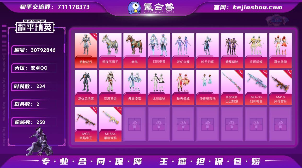 苹果 手Q-无敌战神框-3粉装-6特效枪-2载具-2粉色飞行器-54008热力值-13王牌印记-132套装-169枪皮 【热门品类】:粉装-梦幻火箭,套装-寒蝎幽灵,套装-浪漫天命,套装-都市猎人,套装-派对舞王,套装-深海小丑鱼,套装-小丑鱼,套装-奇异狩猎者,套装-龟仙人,套装-暗影哥特,角色-Mark.06 【粉色载具】:玛莎拉蒂Quattroporte(夜幕蓝),护世瑞兽 【粉色套装】:粉装-极限特训,粉装-梦幻火箭,角色-羊梦糖心 【粉色枪皮等级】:AKM-星际浪客(七级),SCAR-L-青春物语(六级),AUG-许七安(七级),Kar98K-巳巳如意(五级),Mk14-甜梦熊击(五级),DP-28-豹影疾电(五级) 【粉色枪皮】:AKM-星际浪客,SCAR-L-青春物语,AUG-许七安,Kar98K-巳巳如意,Mk14-甜梦熊击,DP-28-豹影疾电 【粉色飞行器】:太空嘟嘟飞行器,万象金身飞行器 【粉色降落伞】:极限特训降落伞,幻影战神降落伞,梦幻火箭降落伞,垂柳戏鸭降落伞,第五大道降落伞,黄族统领降落伞,创世·救赎降落伞,临安公主降落伞,金蛇镇世降落伞,智耀战神降落伞,喜羊羊与灰太狼降落伞,异瞳寒姬降落伞 【稀有套装】:套装-龟仙人,套装-巳巳如意,角色-摩登魅猫,角色-许七安,角色-临安公主,角色-怀庆长公主,套装-燕燕于飞,套装-鱼渊荷华,套装-粉恋花,套装-紫幽梦,套装-蓝冰羽,角色-猎影月神,套装-彩虹兔,套装-云朵鹅,套装-雪绒豹,角色-绛羽幽主,套装-朱霞炽焰,套装-凌霄紫焰,玩偶服-美羊羊,玩偶服-喜羊羊,角色-紫俏灵猫 【稀有枪皮】:AKM-奇异狩猎者,AKM-影袭,AKM-春暖花开,AKM-龙的传人,M16A4-幻世战舞者,M16A4-甜心亚梦,SCAR-L-夜灯,SCAR-L-玉兔迎春,M416-糯团青竹,GROZA-影袭,GROZA-懵萌河马,GROZA-田园牧歌,AUG-天降萌叽,AUG-幻影战神,AUG-甜蜜菠萝,AUG-金蛇镇世,QBZ-彩虹符号,M762-天降萌叽,M762-奇异狩猎者,M76...
