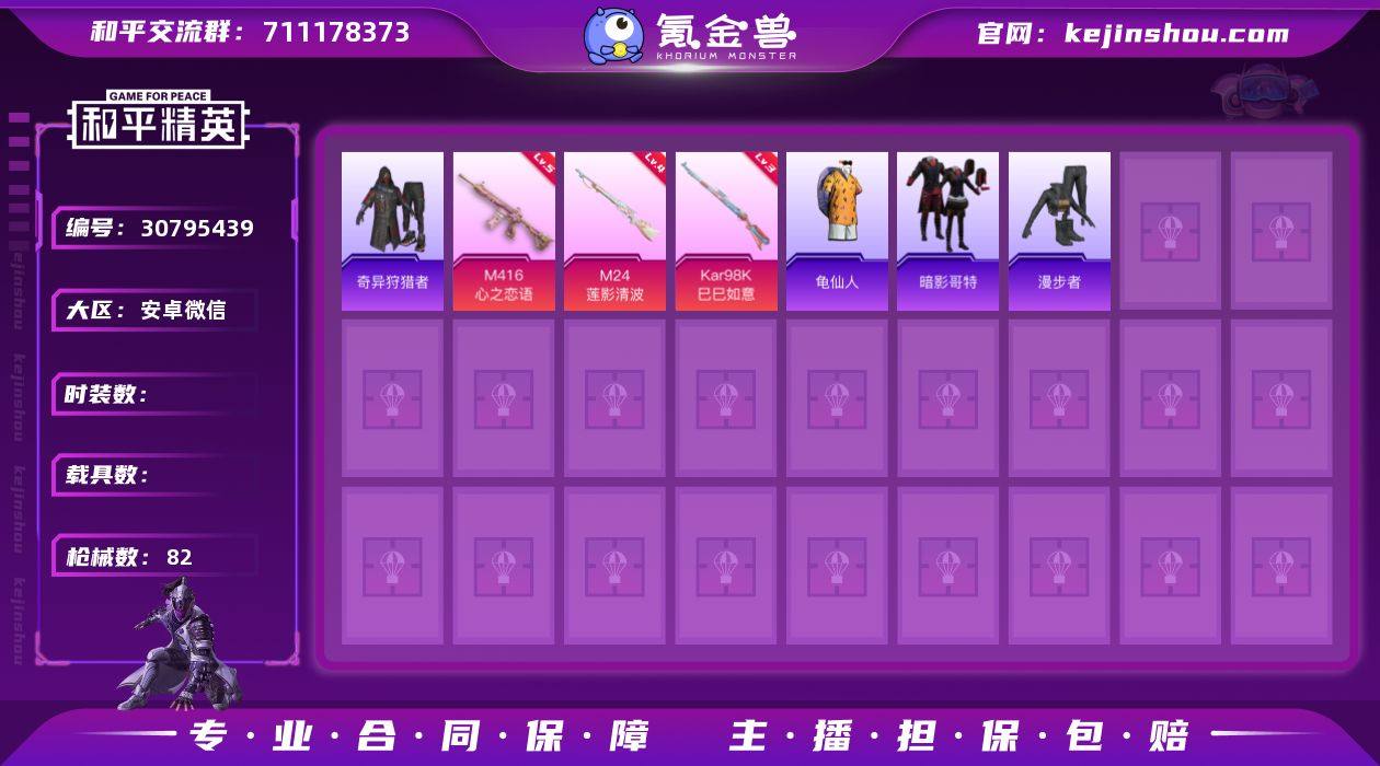 安卓微信 可二次 3特效枪48套装82枪皮 奇异狩猎者 M416-心之恋语(5级) Kar98K-巳巳如意(3级) M24-莲影清波(4级) 金曜白虎背包 龟仙人 暗影哥特 漫步者 M24-奇异狩猎者 和平精英账号