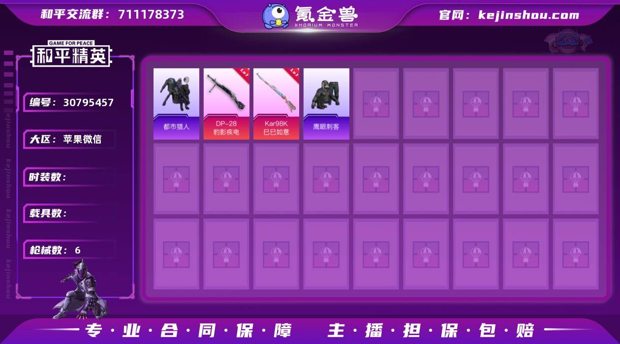 苹果微信 可二次 1稀有2特效枪1热门6套装6枪皮 1740热力值 历史英勇黄金Ⅲ 都市猎人 Kar98K-巳巳如意 (1级) DP-28-豹影疾电 (1级) 鹰眼刺客 和平精英账号