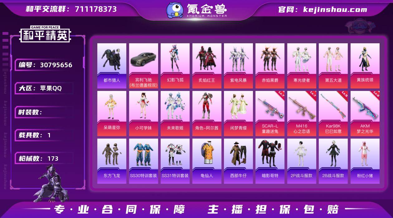 苹果 手Q-15粉装-7特效枪-3载具-4粉色飞行器-47518热力值-7王牌印记-74套装-101枪皮 【热门品类】:粉装-梦幻火箭,套装-龟仙人,套装-粉红小猪 【粉色套装】:粉装-梦幻火箭,粉装-冰霜白皇,粉装-炙焰红王,粉装-薄荷物语,粉装-恐龙拽拽,粉装-庄周梦蝶,粉装-幻梦音符,粉装-绚丽摇曳,粉装-闪耀律动,粉装-橘柚倾心,粉装-冷魅冰骑,粉装-赤焰黑爵,粉装-紫电风暴,粉装-霁雪冰心,粉装-垂柳戏鸭 【粉色枪皮等级】:SCAR-L-梦幻火箭(四级),SCAR-L-青春物语(一级),M762-冷魅冰骑(四级),UMP45-恐龙拽拽(四级),AWM-橘柚倾心(四级),SLR-暗夜玫瑰(四级),DP-28-幻梦音符(四级) 【粉色载具】:路特斯EVIJA(星际黄),路特斯ELETRE(冰川蓝),焰龙咆哮,僚机-萌兔起飞 【粉色枪皮】:SCAR-L-梦幻火箭,SCAR-L-青春物语,M762-冷魅冰骑,UMP45-恐龙拽拽,AWM-橘柚倾心,SLR-暗夜玫瑰,DP-28-幻梦音符 【粉色飞行器】:梦幻火箭飞行器,庄周梦蝶飞行器,幻梦音符飞行器,冷魅冰骑飞行器 【粉色降落伞】:梦幻火箭降落伞,蓝莓炮弹降落伞,恐龙拽拽降落伞,庄周梦蝶降落伞,幻梦音符降落伞,橘柚倾心降落伞,冷魅冰骑降落伞,闪光银龙降落伞,垂柳戏鸭降落伞,暗夜鎏金降落伞,英伦信使降落伞 【稀有套装】:套装-龟仙人,套装-闪电轻猫 【稀有枪皮】:AKM-彩虹符号,AKM-恐龙拽拽,AKM-虎虎生威,M16A4-幻世战舞者,M16A4-甜心亚梦,SCAR-L-炫彩节奏,SCAR-L-玉兔迎春,SCAR-L-红色方程式,M416-夜灯,M416-糯团青竹,M416-紫翼圣骑,M416-红色方程式,GROZA-异彩先驱,GROZA-恐龙拽拽,GROZA-紫翼圣骑,AUG-天降萌叽,AUG-幻梦音符,AUG-耀粉歌者,QBZ-彩虹符号,QBZ-飞驰魅影,M762-天降萌叽,M762-奇异狩猎者,M762-橘柚倾心,M762-瑞龙福将,G36C-冷魅冰骑,G36C-暗夜玫瑰,AC-VAL-天降萌叽,AC-VAL-彩虹甜...