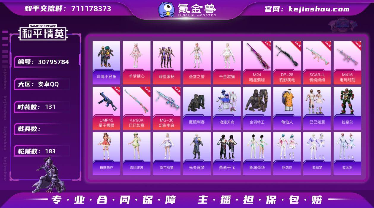 安卓 手Q-4粉装-7特效枪满天赋-55670热力值-11王牌印记-131套装-183枪皮 【热门品类】:套装-浪漫天命,套装-深海小丑鱼,套装-金羽特工,套装-龟仙人 【粉色套装】:粉装-暗星紫秘,角色-圣堂之誓,角色-千金淑猫,角色-羊梦糖心 【粉色枪皮等级】:SCAR-L-锦绣绵绵(五级),M416-电玩时刻(五级),UMP45-量子极限(五级),Kar98K-巳巳如意(五级),M24-暗星紫秘(七级),DP-28-豹影疾电(五级),MG-36-幻彩电音(五级) 【粉色枪皮】:SCAR-L-锦绣绵绵,M416-电玩时刻,UMP45-量子极限,Kar98K-巳巳如意,M24-暗星紫秘,DP-28-豹影疾电,MG-36-幻彩电音 【粉色降落伞】:极限特训降落伞,甜心娃娃降落伞,暗星紫秘降落伞,天星战神降落伞,炫光之旅降落伞,镜光幻境降落伞,圣堂之誓降落伞,守护天翼降落伞,千金淑猫降落伞,鬼刀降落伞,绯穹魔姬降落伞 【稀有套装】:套装-龟仙人,套装-巳巳如意,角色-拉斐尔,套装-糖糖葫芦,套装-青团波波,角色-都市丽猫,角色-光矢逐梦,套装-燕燕于飞,套装-鱼渊荷华,套装-粉恋花,套装-紫幽梦,套装-蓝冰羽,角色-猎影月神 【稀有枪皮】:AKM-彩虹符号,AKM-海渊国主,AKM-生命誓言,AKM-破晓战魂,AKM-萌趣颜团子,AKM-霓虹街区,AKM-龙的传人,M16A4-幻世战舞者,M16A4-红色方程式,M16A4-蓝色火焰,M16A4-千金淑猫,SCAR-L-夜灯,SCAR-L-玉兔迎春,SCAR-L-红色方程式,M416-暗星紫秘,M416-糯团青竹,M416-红色方程式,M416-绯红前夜,M416-蓝色火焰,GROZA-异彩先驱,GROZA-影袭,GROZA-懵萌河马,AUG-天降萌叽,AUG-甜蜜菠萝,AUG-耀粉歌者,QBZ-彩虹符号,M762-天降萌叽,M762-绯红前夜,G36C-懵萌河马,AC-VAL-快闪甜心,蜜獾-天降萌叽,UZI-啾咪啾咪,UZI-天降萌叽,UZI-影袭,UZI-红色方程式,UZI-幻影飞狐,UMP45-夜灯,UMP45-灵符少年,UMP45-生命誓言,UMP45-蓝色...