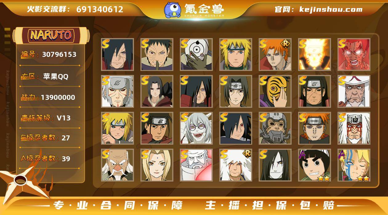 实名: 可修改 贵族等级: V13 S忍数: 27 A忍数: 39 战力值(万): 1390 战力排行: 本服前一百 S级忍者: 千手柱间「秽土转生」,宇智波鼬「秽土转生」,佩恩·天道「超」,药师兜「仙人模式」,宇智波斑「秽土转生」,宇智波斑 「木叶创立」,半藏「秽土转生」,千手扉间「秽土转生」,波风水门「秽土转生」,千手柱间,神秘面具男,佩恩「天道」,大蛇丸,波风水门,纲手,宇智波鼬 「须佐能乎」,自来也「仙人模式」,猿飞日斩,迈特凯「死门」,大野木 「忍界大战」,宇智波带土 「忍界大战」,自来也 「舞之豪杰」,宇智波斑「白面具」,漩涡鸣人 「九喇嘛连结」,大筒木金式「博人传」,宇智波斑「秽土转生·解」 通灵兽: 熊猫