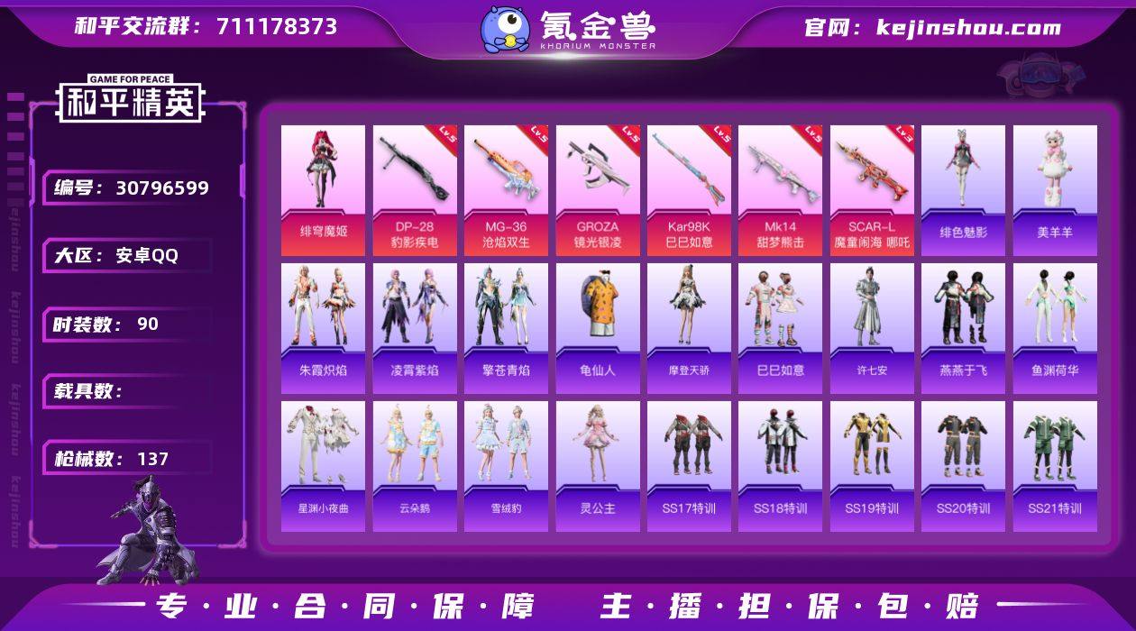 安卓手Q-1粉装-6特效枪-0载具-1粉色飞行器-37463热力值-9王牌印记-90套装-137枪皮 【热门品类】:套装-龟仙人 【粉色套装】:角色-绯穹魔姬 【粉色枪皮等级】:SCAR-L-魔童闹海 哪吒(三级),GROZA-镜光银凌(五级),Kar98K-巳巳如意(五级),Mk14-甜梦熊击(五级),DP-28-豹影疾电(五级),MG-36-沧焰双生(五级) 【粉色枪皮】:SCAR-L-魔童闹海 哪吒,GROZA-镜光银凌,Kar98K-巳巳如意,Mk14-甜梦熊击,DP-28-豹影疾电,MG-36-沧焰双生 【粉色飞行器】:飞天猪飞行器 【粉色降落伞】:翩跹演武降落伞,第五大道降落伞,盛世惊鸿降落伞,鬼刀降落伞 【稀有套装】:套装-龟仙人,套装-摩登天骄,套装-巳巳如意,套装-雪国风尚,角色-许七安,套装-燕燕于飞,套装-鱼渊荷华,套装-星渊小夜曲,套装-云朵鹅,套装-雪绒豹,角色-灵公主,套装-朱霞炽焰,套装-凌霄紫焰,套装-擎苍青焰,玩偶服-美羊羊,角色-绯色魅影 【稀有枪皮】:AKM-夜灯,AKM-灼热熔岩,AKM-破晓战魂,M16A4-幻世战舞者,M16A4-红色方程式,M16A4-蓝色火焰,SCAR-L-夜灯,SCAR-L-炫彩节奏,SCAR-L-玉兔迎春,SCAR-L-红色方程式,SCAR-L-净心行者,M416-红色方程式,M416-蓝色火焰,GROZA-彩虹符号,GROZA-荧海星豚,AUG-天降萌叽,AUG-耀粉歌者,QBZ-彩虹符号,QBZ-洛神天依,M762-彩虹符号,M762-瑞龙福将,M762-云朵鹅,AC-VAL-天降萌叽,蜜獾-天降萌叽,蜜獾-娇憨猪猪,ARX-凌霄紫焰,UZI-天降萌叽,UZI-娇憨猪猪,UZI-红色方程式,UMP45-夜灯,UMP45-蓝色火焰,Vector-生命誓言,Vector-创世·救赎,汤姆逊-耀粉歌者,AKS-74U-鬼刀,JS9-凌霄紫焰,JS9-蓝晶绮麟,P90-巳巳如意,Kar98K-炫彩节奏,Kar98K-红色方程式,M24-炫彩节奏,M24-奇异狩猎者,M24-蓝晶绮麟,AWM-盛世惊鸿,SKS-炫彩节奏,SKS-迅猛狂鲨,Mini14-耀粉歌者,SLR-娇憨猪猪,SLR-彩...