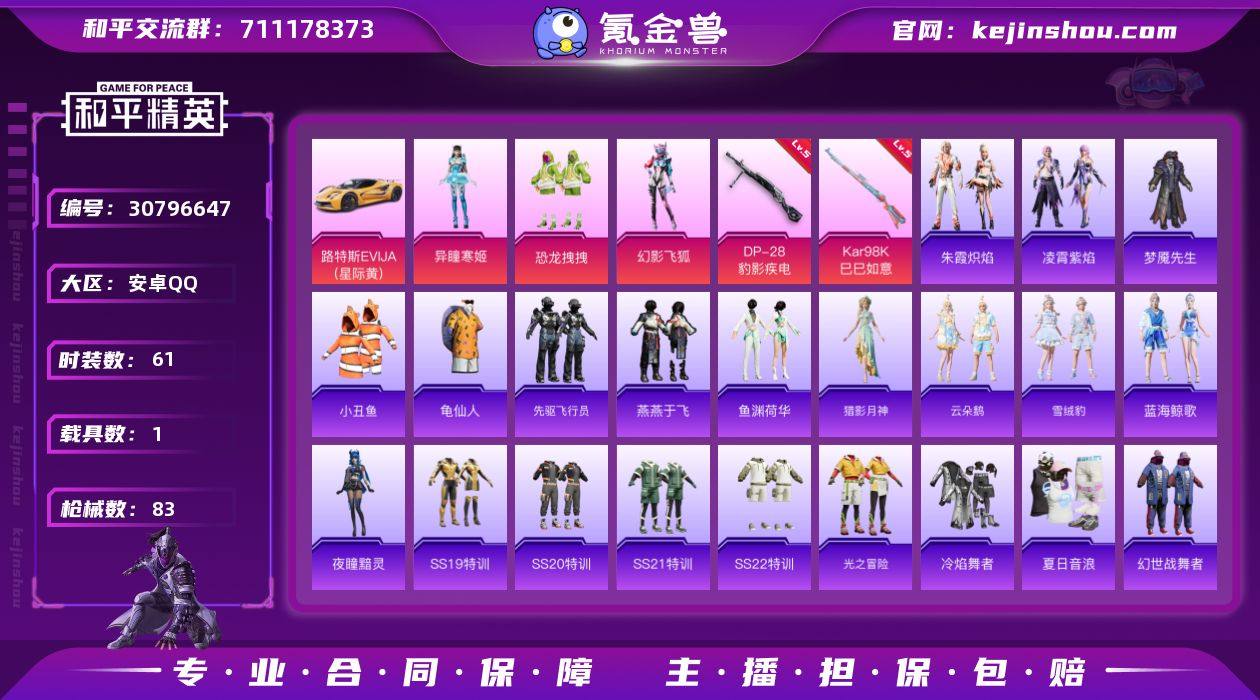 安卓 手Q-3粉装-2特效枪-1载具-0粉色飞行器-27060热力值-1王牌印记-61套装-83枪皮HZ261113 【热门品类】:套装-小丑鱼,套装-龟仙人 【粉色套装】:粉装-恐龙拽拽,粉装-幻影飞狐,角色-异瞳寒姬 【粉色枪皮等级】:Kar98K-巳巳如意(五级),DP-28-豹影疾电(五级) 【粉色载具】:路特斯EVIJA(星际黄) 【粉色枪皮】:Kar98K-巳巳如意,DP-28-豹影疾电 【粉色降落伞】:洛神天依降落伞,恐龙拽拽降落伞,庄周梦蝶降落伞,幻梦音符降落伞,垂柳戏鸭降落伞,旋转彩虹降落伞,繁龙极客降落伞,绝色倾城降落伞,未来领航者降落伞,幻影飞狐降落伞,智耀战神降落伞,幻星舰长降落伞,幻彩电音降落伞,冷漠罗丽降落伞,炫彩糖果降落伞 【稀有套装】:套装-龟仙人,套装-先驱飞行员,套装-燕燕于飞,套装-鱼渊荷华,角色-猎影月神,套装-云朵鹅,套装-雪绒豹,套装-蓝海鲸歌,角色-夜瞳黯灵,套装-朱霞炽焰,套装-凌霄紫焰 【稀有枪皮】:AKM-奇异狩猎者,AKM-破晓战魂,AKM-龙的传人,M16A4-幻世战舞者,SCAR-L-玉兔迎春,M416-糯团青竹,M416-蓝色火焰,AUG-天降萌叽,AUG-耀粉歌者,M762-奇异狩猎者,M762-彩虹符号,M762-云朵鹅,Mk47-虚空骇客,AC-VAL-天降萌叽,蜜獾-天降萌叽,蜜獾-娇憨猪猪,ARX-凌霄紫焰,UZI-娇憨猪猪,UZI-影袭,UMP45-蓝色火焰,汤姆逊-环太平洋,JS9-凌霄紫焰,P90-巳巳如意,Kar98K-彩虹符号,Kar98K-炫彩节奏,Mini14-金玉无双,Mini14-绯穹魔姬,SLR-娇憨猪猪,M417-猪猪侠,SVD-云朵鹅,S686-生命誓言,S1897-炫彩节奏,S12K-垂柳戏鸭,S12K-娇憨猪猪,S12K-幻世战舞者,DBS-荧海星豚,DBS-幻彩电音,SPAS-12-云朵鹅,MG3-幻世战舞者,MG-36-凌霄紫焰,P92-凌霄紫焰,沙漠之鹰-云朵鹅,大砍刀-云朵鹅,大砍刀-鬼刀,撬棍-咒蚀之裁,平底锅-凌霄紫焰 【其他套装】:套装-SS19特训,套装-S...