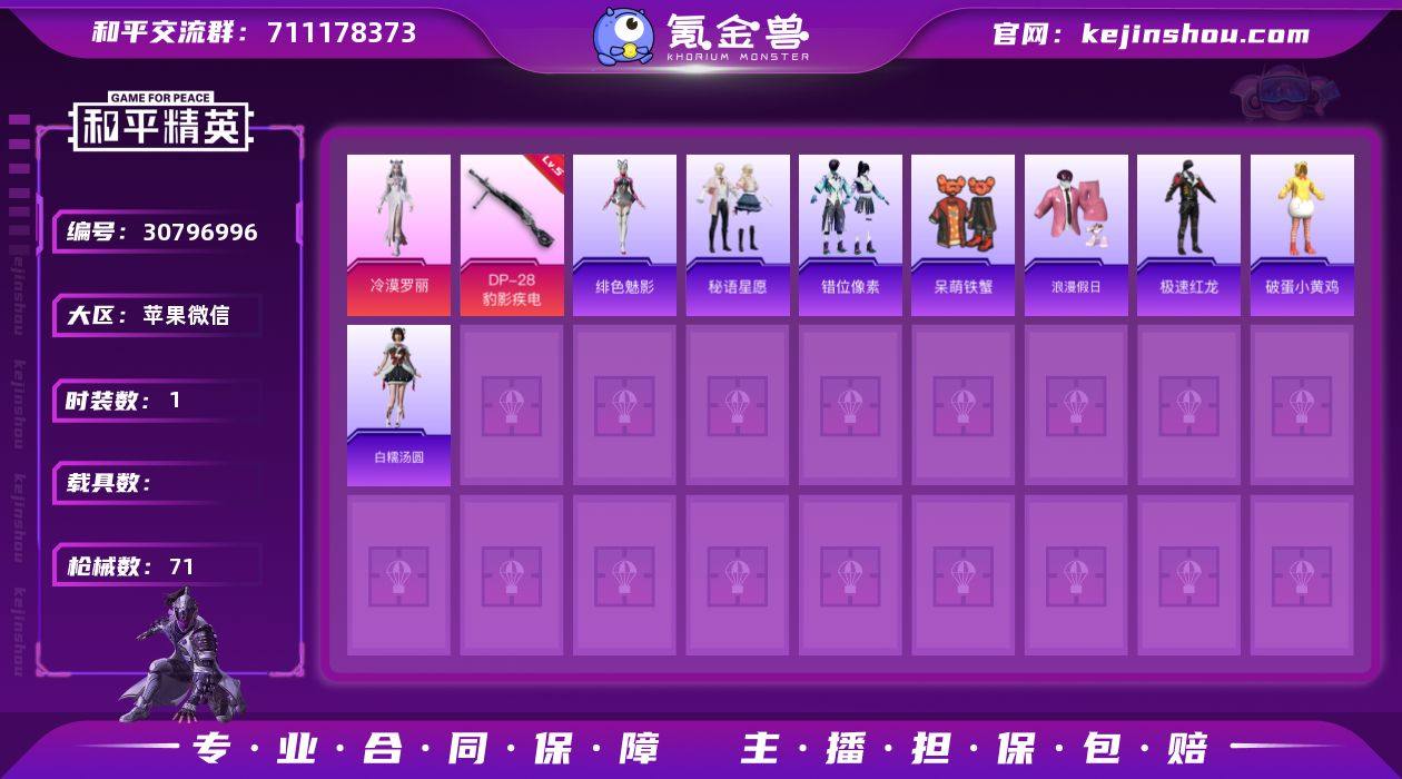 苹果微信 可二次 1粉装1特效枪48套装71枪皮 AKM-缤纷海域 冷漠罗丽 DP-28-豹影疾电(5级) 浪漫假日 呆萌铁蟹 破蛋小黄鸡 极速红龙 和平精英账号
