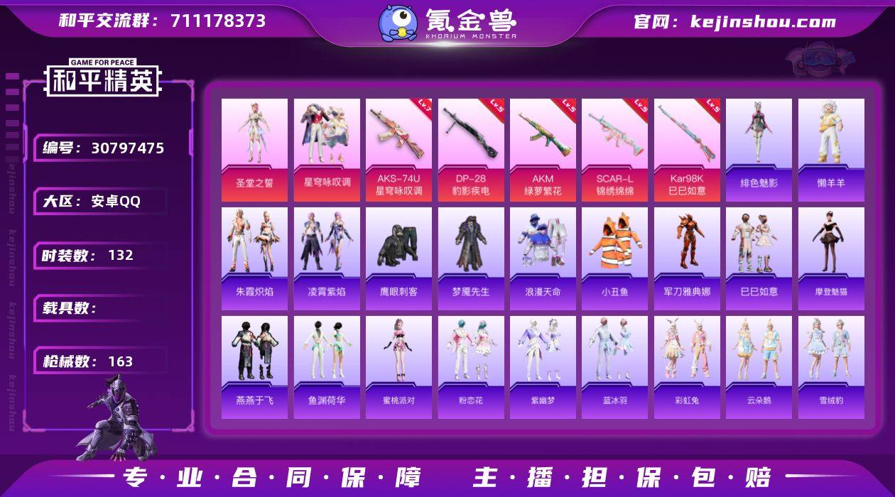 安卓 手Q-2粉装-5特效枪-0载具-0粉色飞行器-47275热力值-6王牌印记-132套装-163枪皮 【热门品类】:套装-浪漫天命,套装-小丑鱼,角色-军刀雅典娜 【粉色套装】:角色-圣堂之誓,粉装-星穹咏叹调 【粉色枪皮等级】:AKM-绿萝繁花(五级),SCAR-L-锦绣绵绵(五级),AKS-74U-星穹咏叹调(七级),Kar98K-巳巳如意(五级),DP-28-豹影疾电(五级) 【粉色枪皮】:AKM-绿萝繁花,SCAR-L-锦绣绵绵,AKS-74U-星穹咏叹调,Kar98K-巳巳如意,DP-28-豹影疾电 【粉色降落伞】:至尊龙雀降落伞,未来歌姬降落伞,闲梦青缨降落伞,圣堂之誓降落伞,千金淑猫降落伞,星穹咏叹调降落伞 【稀有套装】:套装-巳巳如意,角色-摩登魅猫,套装-燕燕于飞,套装-鱼渊荷华,角色-蜜桃派对,套装-粉恋花,套装-紫幽梦,套装-蓝冰羽,套装-彩虹兔,套装-云朵鹅,套装-雪绒豹,套装-朱霞炽焰,套装-凌霄紫焰,玩偶服-懒羊羊,角色-绯色魅影 【稀有枪皮】:AKM-彩虹符号,AKM-环太平洋,AKM-缤纷海域,AKM-霓虹街区,AKM-龙的传人,M16A4-幻世战舞者,SCAR-L-玉兔迎春,SCAR-L-红色方程式,M416-暗夜行者,M416-糯团青竹,M416-蓝色火焰,GROZA-影袭,GROZA-恐龙拽拽,GROZA-田园牧歌,AUG-耀粉歌者,AUG-月影灵韵,QBZ-彩虹符号,QBZ-飞驰魅影,M762-天降萌叽,M762-云朵鹅,Mk47-妙红点点,AC-VAL-天降萌叽,AC-VAL-快闪甜心,蜜獾-天降萌叽,蜜獾-娇憨猪猪,蜜獾-绯穹魔姬,ARX-凌霄紫焰,UZI-啾咪啾咪,UZI-娇憨猪猪,UZI-影袭,UMP45-涂山之恋,UMP45-生命誓言,UMP45-蓝色火焰,Vector-焰鹰斗篷,Vector-生命誓言,Vector-田园牧歌,Vector-创世·救赎,汤姆逊-天降萌叽,汤姆逊-炫彩节奏,汤姆逊-耀粉歌者,JS9-凌霄紫焰,P90-快闪甜心,P90-飞驰魅影,Kar98K-六号树人,Kar98K-彩虹符号,Kar98K-炫彩节奏,Kar98K-飞驰魅影,M24-影袭,M24-歌...