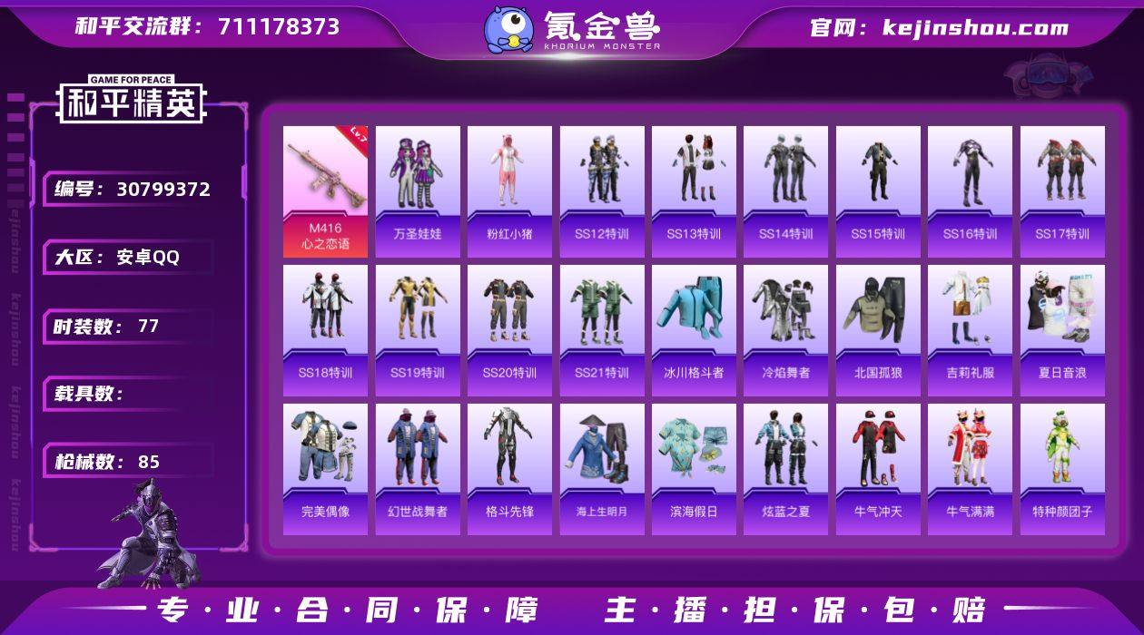 安卓 手Q-0粉装-1特效枪-0载具-0粉色飞行器-28842热力值-6王牌印记-77套装-85枪皮 【热门品类】:套装-粉红小猪 【粉色枪皮等级】:M416-心之恋语(七级) 【粉色枪皮】:M416-心之恋语 【粉色降落伞】:阿狸红降落伞,王牌四分卫降落伞,暗夜玫瑰降落伞,恐龙拽拽降落伞 【稀有枪皮】:AKM-夜灯,AKM-彩虹符号,AKM-星之彼岸,AKM-灼热熔岩,AKM-萌趣颜团子,AKM-虎虎生威,M16A4-夜灯,M16A4-甜心亚梦,SCAR-L-红色方程式,SCAR-L-黄金龙骨,M416-蓝色火焰,GROZA-治愈之星,AUG-青春冒险家,QBZ-原初圣火,QBZ-彩虹符号,QBZ-飞驰魅影,M762-牛气冲天,M762-瑞龙福将,M762-镭射皇者,Mk47-青春冒险家,G36C-暗夜玫瑰,AC-VAL-天降萌叽,AC-VAL-甜心亚梦,蜜獾-天降萌叽,蜜獾-娇憨猪猪,UZI-娇憨猪猪,UZI-炫彩节奏,UZI-红色方程式,UMP45-生命誓言,UMP45-诡娃娃,Vector-夜灯,Vector-彩虹符号,Vector-治愈之星,Vector-生命誓言,汤姆逊-银刃赛罗,野牛-夜灯,野牛-青春冒险家,P90-筑梦精灵,P90-飞驰魅影,Kar98K-彩虹符号,Kar98K-炫彩节奏,Kar98K-飞驰魅影,M24-治愈之星,M24-香水柠檬,SKS-心之恋语,VSS-镭射皇者,Mini14-原初圣火,Mini14-阿狸红,Mk14-治愈之星,Win94-瑞龙福将,SLR-娇憨猪猪,QBU-青春冒险家,S686-红色方程式,S1897-镭射皇者,S1897-飞驰魅影,S12K-瑞龙福将,S12K-娇憨猪猪,DBS-甜心亚梦,M249-四圣焕新,DP-28-原初圣火,DP-28-甜心亚梦,MG3-瑞龙福将,P18C-原初圣火 【其他套装】:套装-SS12特训,套装-SS13特训,套装-SS14特训,套装-SS15特训,套装-SS16特训,套装-SS17特训,套装-SS18特训,套装-SS19特训,套装-SS20特训,套装-SS21特训,套装-冰川格斗者,套装-冷焰舞者,套装-北国孤狼,套装-吉莉礼服,套装-夏日音浪,套装-完美偶像,套装-幻世战舞者,套装-格...