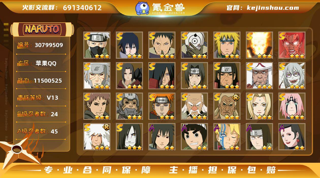 IOS/24S忍/45A忍/战力1150W/V13/区服421 【S忍者】 宇智波斑「秽土转生·解」,宇智波佐助「永恒万花筒」,春野樱「忍界大战」,漩涡鸣人「九喇嘛连结」,大野木「忍界大战」,迈特凯「死门」,宇智波带土「忍界大战」,千手柱间「秽土转生」,罗砂「四代目风影」,自来也「舞之豪杰」,旗木卡卡西「须佐能乎」,宇智波鼬「秽土转生」,药师兜「仙人模式」,宇智波斑「秽土转生」,艾「三代目雷影」,宇智波斑「白面具」,半藏「秽土转生」,千手扉间「秽土转生」,宇智波鼬「须佐能乎」,佩恩「天道」,猿飞日斩,波风水门,大蛇丸,纲手, 【A忍者】 长十郎「六代目水影」,不缘,日向宁次「忍界大战」,漩涡博人「桃式显现」,李洛克「忍界大战」,宇智波泉奈,宇智波止水,长门「青年」,艾「青年」,照美冥「侠隐江湖」,达鲁伊「五代目雷影」,不风,神秘面具男「忍者之路」,波风水门「青年」,奇拉比「忍界大战」,宇智波佐助「须佐能乎」,迪达拉「秽土转生」,旗木卡卡西「忍界大战」,漩涡鸣人「九尾查克拉」,千代「近松十人卫」,药师兜「半蛇斗篷」,地陆,我爱罗「忍界大战」,秋道丁次「忍界大战」,大蛇丸「晓」,春野樱「百豪」,波风水门「新春限定」,照美冥「五代目水影」,志村团藏,迈特凯「惊门」,奇拉比,漩涡鸣人「仙人模式」,角都「地怨虞」,飞段「死司凭血」,飞段,迪达拉,我爱罗「疾风传」,蝎,干柿鬼鲛,宇智波鼬,猿飞阿斯玛,迈特凯, PX_2230735