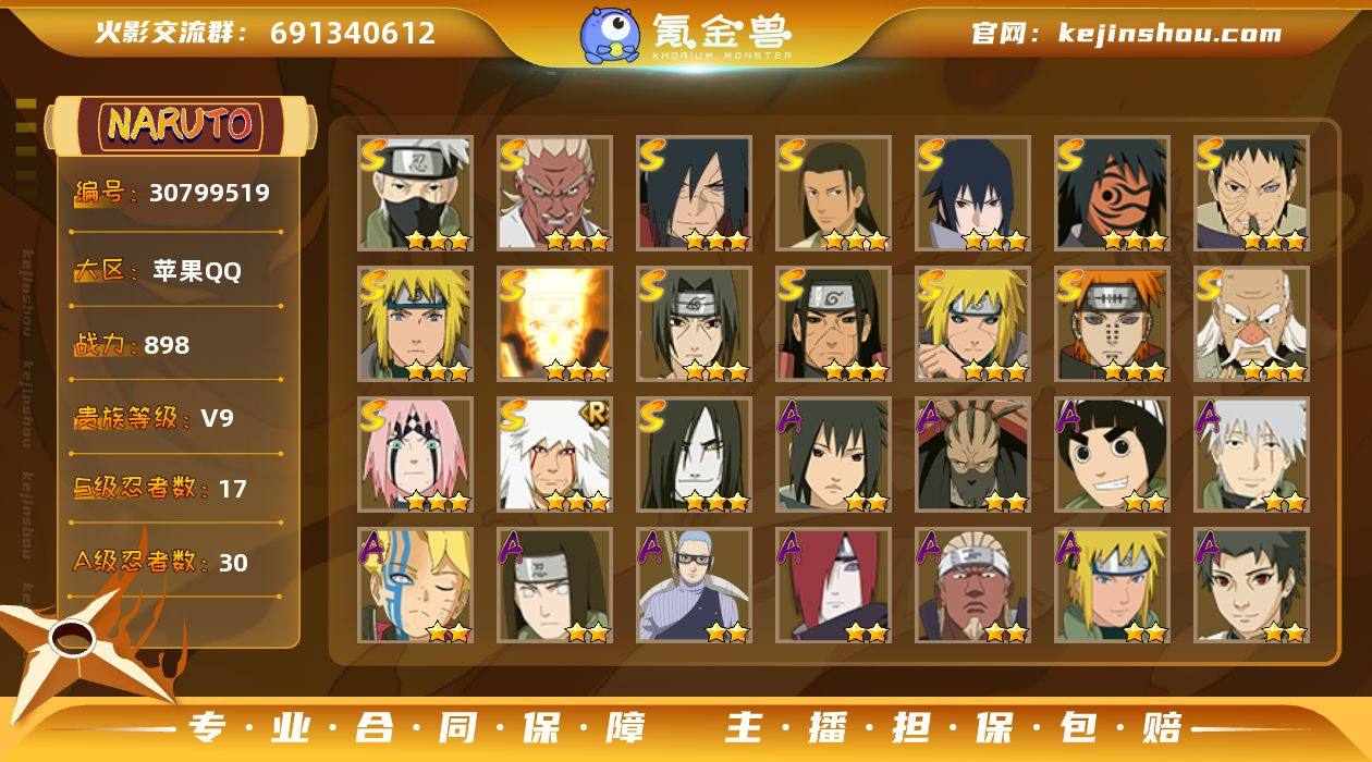 17S级忍者数-30A级忍者数 【S级忍者】:波风水门「秽土转生」(3星),千手柱间「秽土转生」(3星),宇智波斑「秽土转生·解」(3星),大野木「忍界大战」(3星),春野樱「忍界大战」(3星),宇智波带土「忍界大战」(3星),艾「忍界大战」(3星),宇智波鼬「须佐能乎」(3星),旗木卡卡西「须佐能乎」(3星),千手柱间「木叶创立」(3星),自来也「舞之豪杰」(3星),大蛇丸(3星),波风水门(3星),神秘面具男「红夜之刃」(3星),漩涡鸣人「九喇嘛连结」(3星),佩恩「天道」(3星),宇智波佐助「永恒万花筒」(3星) 【A级忍者】:艾「青年」(2星),长门「青年」(2星),波风水门「青年」(2星),达鲁伊「博人传」(2星),大蛇丸「晓」(2星),奇拉比(2星),飞段(3星),飞段「死司凭血」(2星),干柿鬼鲛(5星),漩涡博人「桃式显现」(2星),漩涡鸣人「仙人模式」(2星),漩涡鸣人「九尾查克拉」(2星),迈特凯(5星),旗木卡卡西「幻之真容」(2星),我爱罗「疾风传」(4星),蝎(3星),蝎「绯流琥」(2星),猿飞阿斯玛(5星),宇智波止水「新春限定」(2星),宇智波鼬(2星),宇智波佐助「须佐能乎」(2星),宇智波佐助「万花筒写轮眼」(2星),日向宁次「忍界大战」(2星),长十郎「六代目水影」(2星),李洛克「忍界大战」(2星),猿飞木叶丸「博人传」(2星),黑土「博人传」(2星),秋道丁次「忍界大战」(2星),千代「近松十人卫」(2星),宇智波泉奈(2星)