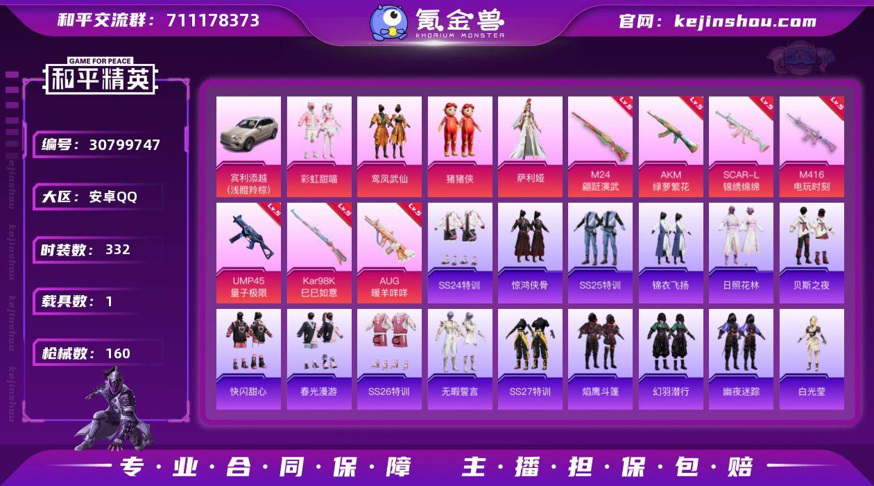 1载具 7升级枪 4粉装 160枪皮 90套装 46784热力 9印记 星钻 宾利添越(浅瞪羚棕) 六级M24-翩跹演武 五级M416-电玩时刻,五级SCAR-L-锦绣绵绵,五级AKM-绿萝繁花,五级UMP45-量子极限,五级Kar98K-巳巳如意,五级AUG-暖羊咩咩 鸾凤武仙,彩虹甜喵,猪猪侠,萨利娅