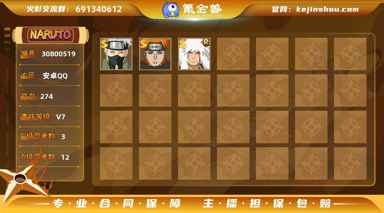 355011|安卓QQ 4188区 274w战力 v7 S忍者数:3 A忍者数:12 时装3安卓QQ 4188区 S忍者数:3 A忍者数:12 忍者:旗木卡卡西「须佐能乎」,自来也「舞之豪杰」,佩恩「天道」,宇智波带土「漂泊浪客」,宇智波泉奈,蝎「绯流琥」,李洛克「忍界大战」,宇智波鼬「夏日限定」,角都「秽土转生」,迪达拉,蝎,干柿鬼鲛,宇智波鼬,猿飞阿斯玛,迈特凯,日向花火「武当宗师」,野原琳「漂泊浪客」,佐井「最终章」,御手洗红豆「新春限定」,月光疾风「秽土转生」,佩恩「饿鬼道」,奈良鹿丸「最终章」,鬼灯满月「忍刀七人众」,春野樱「忍者少女」,枫「七尾人柱力」,惠比寿,木叶丸「疾风传」,宇智波佐助「新春限定」,油女志乃「疾风传」,重吾,天天「疾风传」,秋道丁次「疾风传」,李洛克「疾风传」,山中井野「疾风传」,勘九郎「疾风传」,宇智波佐助「疾风传」,春野樱「疾风传」,漩涡鸣人「疾风传」,君麻吕,夕日红,御手洗红豆,君麻吕「咒印」,山中井野「赛事限定」,多由也「秽土转生」,山城青叶,水木「咒印」,萨克镫,漩涡鸣人「忍者学员」,日向花火,手鞠「镰多利」,多由也,左近右近,次郎坊,海野伊鲁卡,宇智波佐助「写轮眼」,静音,勘九郎,秋道丁次,手鞠,油女志乃,天天,犬塚牙,日向宁次,奈良鹿丸,日向雏田,李洛克,山中井野,宇智波佐助,春野樱,漩涡鸣人