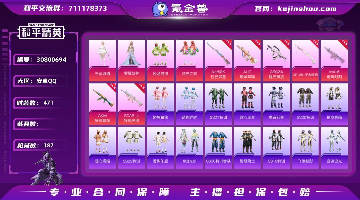 7升级枪 4粉装 16副套 1飞行器 187枪皮 125套装 55398热力 9印记 五级M416-电玩时刻,五级SCAR-L-锦绣绵绵,五级AKM-绿萝繁花,五级DP-28-千金淑猫,五级GROZA-镜光银凌,五级Kar98K-巳巳如意,五级AUG-暖羊咩咩 恐龙拽拽,炫光之旅,千金淑猫,智耀战神