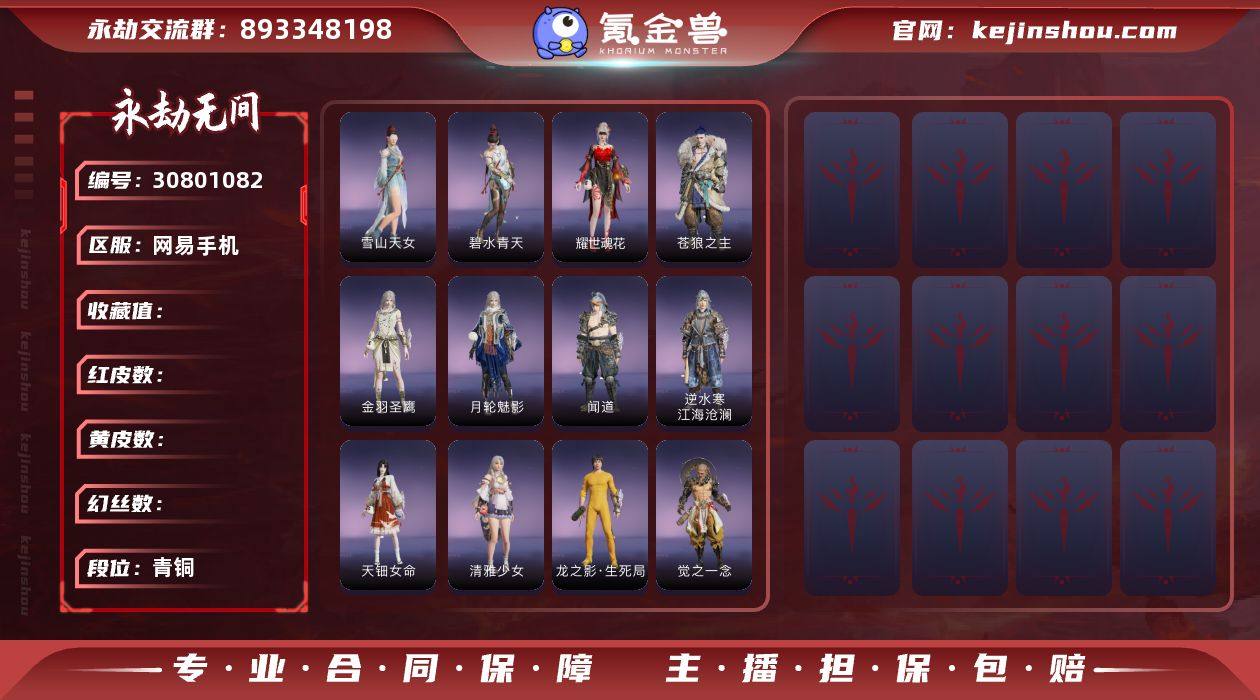 小号 3红97金 红皮: 熛怒炼火(季沧海皮肤),冰魄(长剑皮肤),狼主(阔刀皮肤) t3219 宁红夜金皮: 雪山天女,碧水青天,耀世魂花 特木尔金皮: 苍狼之主 迦南金皮: 金羽圣鹰,月轮魅影 季沧海金皮: 闻道,逆水寒·江海沧澜 胡桃金皮: 清雅少女,天钿女命 天海金皮: 八宝龙王,裟伽龙王,不动明王,觉之一念,龙之影·生死局,若水尊者 岳山金皮: 骁骑,龙之影·过江龙 无尘金皮: 若谷 沈妙金皮: 观山海·腓腓 飞索金皮: 冰链,铁护臂 长剑金皮: 阴阳师·伞剑,华夏神兵·永乐宝剑 太刀金皮: 雷赐,数珠丸,黑绳 阔刀金皮: 听涛,决战平安京·朔方之刃,龙蟠 长枪金皮: 九尺沁金耙,委蛇矛,凌云志,建木,长虹 棍金皮: 学宫之杖 匕首金皮: 鹰吻,华夏神兵·马首刀 双节棍金皮: 玉矩,精武,地火涌,镇魔杵,衔谷 双刀金皮: 破重云,天威 弓箭金皮: 古月,青花 远程金皮: 石中火(鸟铳),炎魔(喷火筒),出渊蛟(鸟铳),吞海鲛(火炮),梦魇(五眼铳),炉中火(五眼铳),金蝎(鸟铳),镇海(连弩) 饰品金皮: 婵娟(崔三娘背饰),雾隐繁花(宁红夜面部),碧玉髓(季沧海面部),虎头帽(特木尔头部),摇清枫(宁红夜后腰),战狼弯角盔(特木尔头部),御狼号角(特木尔左前腰),雪绒帽(迦南头部),雪鹿雄角(季沧海头部),浪焰青藤帽(季沧海头部),火石袋(季沧海右后腰),福虎帽(胡桃头部),蓝樱灯(胡桃左腰),凤尾皂金盔(岳山头部),寒酥银粟(顾清寒头部),妙法兜帽(沈妙头部),伏魔杵(天海右腰),观山海·夏鼓(季沧海右腰),九阴鳞(宁红夜面部)