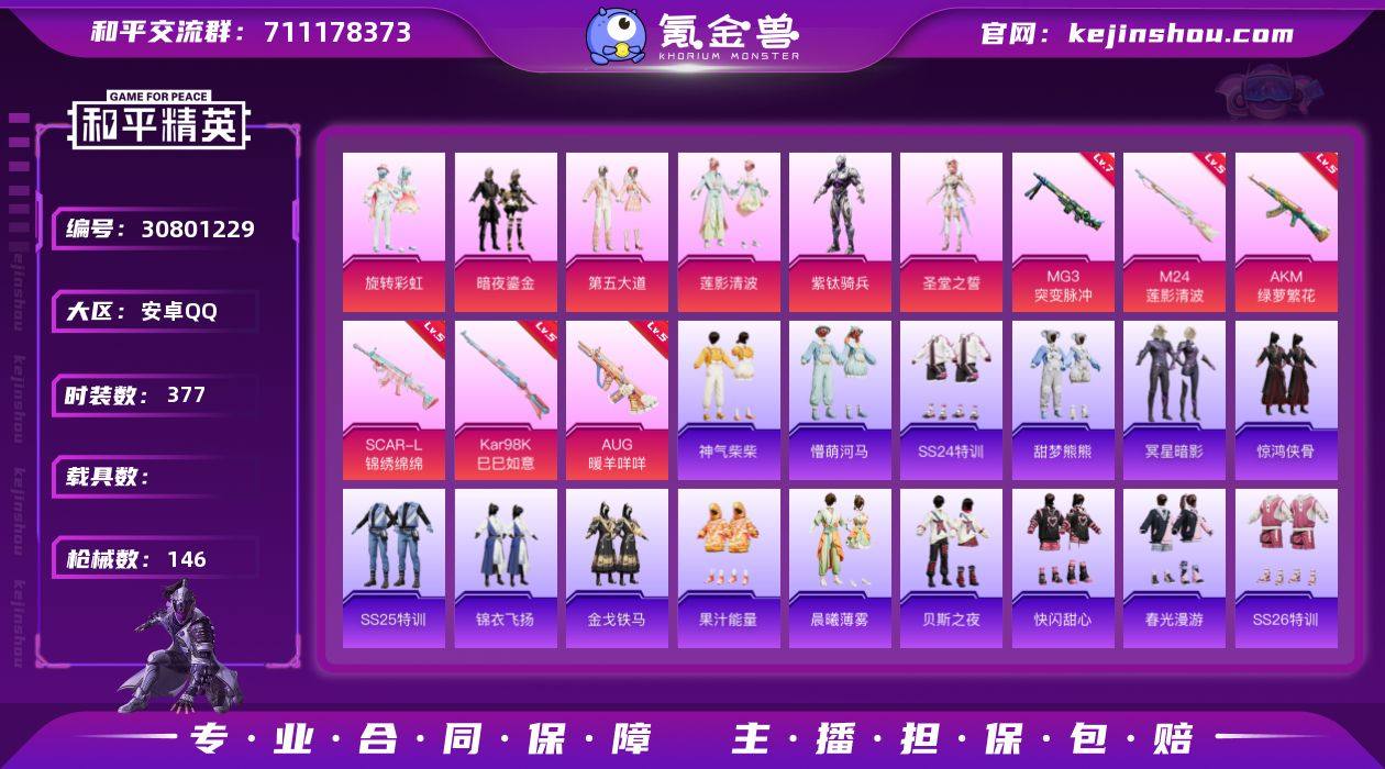 6升级枪 6粉装 146枪皮 100套装 47592热力 6印记 星钻 七级MG3-突变脉冲 五级SCAR-L-锦绣绵绵,五级M24-莲影清波,五级AKM-绿萝繁花,五级Kar98K-巳巳如意,五级AUG-暖羊咩咩 旋转彩虹,暗夜鎏金,第五大道,莲影清波,紫钛骑兵,圣堂之誓 甜梦熊熊,神气柴柴,懵萌河马,SS24特训,冥星暗影,金戈铁马,锦衣飞扬,SS25特训,惊鸿侠骨,果汁能量,晨曦薄雾,SS26特训,春光漫游,快闪甜心,贝斯之夜,彩霞狙击,无暇誓言,明鸳圣池,纯真浪花,热情海星,SS28特训,粉日山川,雏菊兔兔,萝兰蝴蝶,SS29特训,星途旅人,竞技名士,玉兔迎春,巳巳如意,森林游猎者,智谋强哥,蜜桃派对,恋语绒绒,猎影月神,青玉碎影,绯格组合,萌黄之夏,耀粉歌者