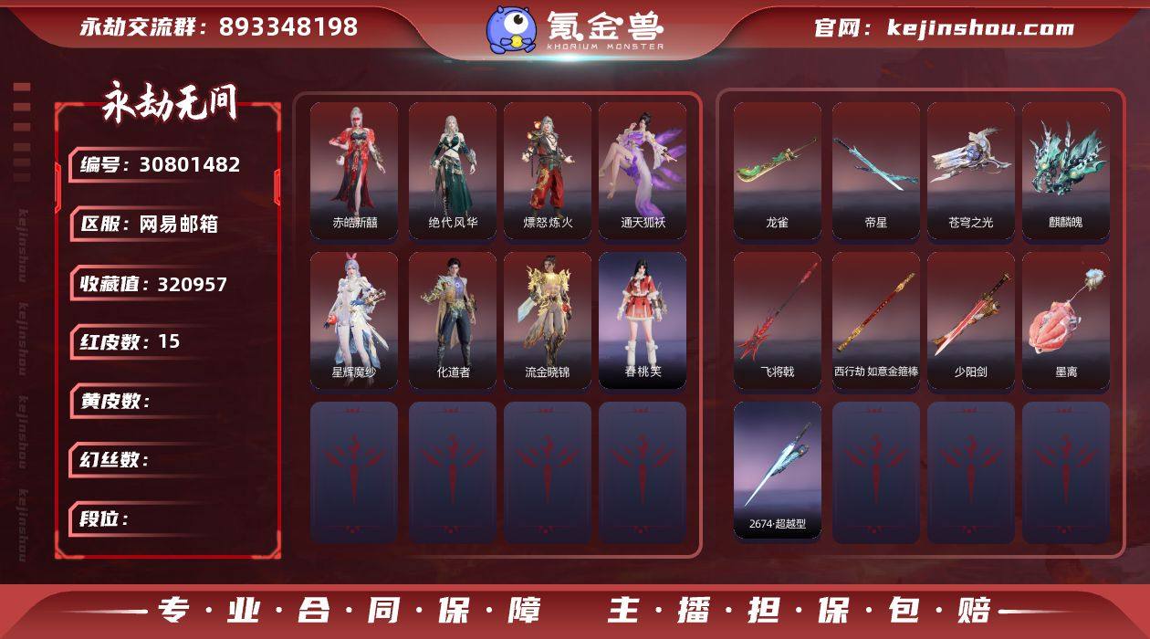 版本: 终极版 等级: 178 幻丝数: 5 红皮数: 7 金皮数量: 180 红皮: 墨离(飞索皮肤),熛怒炼火(季沧海皮肤),狼主(阔刀皮肤),狂龙(双节棍皮肤),化生明王(天海皮肤),赤皓新囍(宁红夜皮肤),锦鲤玉扇(扇皮肤) 宁红夜金皮: 红川仙子,西行劫·蜘蛛精,耀世魂花,夜华朝 特木尔金皮: 斗罗大陆·唐三 迦南金皮: 观山海·青鸟 胡桃金皮: 御宅罗梦(白丝),清雅少女 天海金皮: 八宝龙王 崔三娘金皮: 赤雾烟霞,观山海·文鳐,绿野守护·暗沼摩罗 岳山金皮: 长歌诗韵·戍关将 无尘金皮: 司天命,梨园传奇·柳生 玉玲珑金皮: 黄昏巫主,夏日派对·赤夏悠漾 顾清寒金皮: 赤丹朱湛 殷紫萍金皮: 新倩女幽魂·瑶光沐月,智绘·萍之缘 沈妙金皮: 街头狂欢·涂鸦少女,绿野守护·悠竹萌客 胡为金皮: 观山海·秋神蓐收 季莹莹金皮: 观山海·冬神玄冥 哈迪金皮: 夜绸袍 飞索金皮: 飞鼠 长剑金皮: 壶中日月,含光承影,监星尺,隐锋,2674·原型 太刀金皮: 雷赐 斩马刀金皮: 观山海·朱明,劫涛·潮 长枪金皮: 建木,长虹,观山海·金神钺,灵木角 棍金皮: 打狗棒,学宫之杖 匕首金皮: 华夏神兵·马首刀,仙舞,桡尺刀 双节棍金皮: 精武,镇魔杵,嘶风,月瞳,夔牛槌 双刀金皮: 破重云,祸忌,空寒 双戟金皮: 观山海·水衡 横刀金皮: 烛泪,白鹿 拳刃金皮: 绿野守护·毛乎乎 弓箭金皮: 仙毫 远程金皮: 龙啸(火炮),竹霹雳(火炮),造景(火炮),萤火(鸟铳),鹦鹉螺(五眼铳),观山海·嘉果花(火炮),虎踞(五眼铳),镇海(连弩),赤霞(五眼铳),引冰落(鸟铳),绿野守护·雨幕(鸟铳) 饰品金皮: 阴阳灵狐(胡桃后腰),雾隐繁花(宁红夜面部),雪鹿雄角(季沧海头部),福虎帽(胡桃头部),雪鹿雌角(崔三娘头部),炎流云禅笠(天海头部),龙葵拂(殷紫萍右前腰),骇人面具(武田信忠右后腰),凯旋盔(岳山头部),癸卯兔(顾清寒头部),素心流光卷(殷紫萍右前腰),夜明灯(顾清寒左前腰),武君(武田信忠背部),西行劫·神君印(岳山变身器),金辉袋(季沧海左前腰)【2025年 1.6可二次换绑、期间可登录网易大神正常玩游戏】