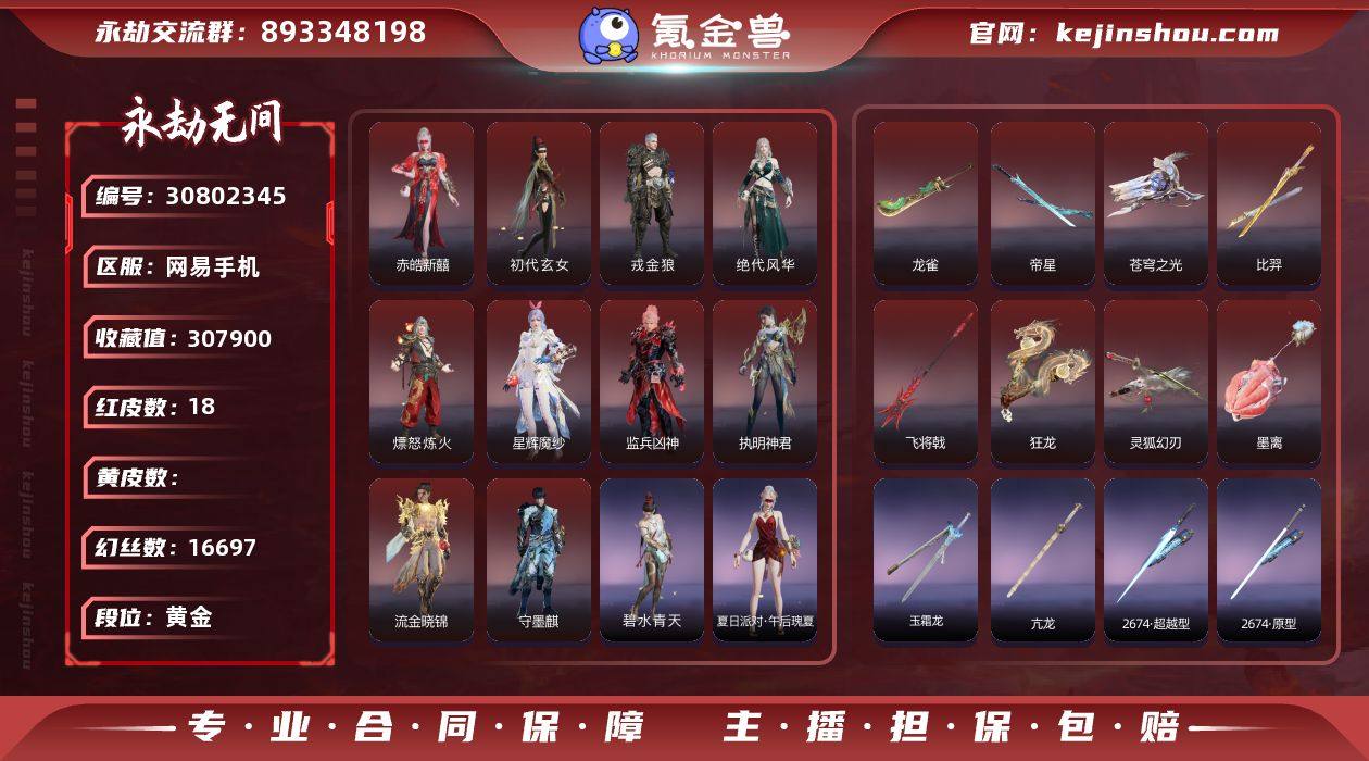 守墨麒 11泳装【红皮】:墨离(飞索皮肤),初代玄女(宁红叶皮肤),戎金狼(特木尔皮肤),绝代风华(迦南皮肤),熛怒炼火(季沧海皮肤),灵狐幻刃(太刀皮肤),狂龙(双节棍皮肤),赤皓新囍(宁红夜皮肤),飞将戟(斩马刀皮肤),监兵凶神(胡为皮肤),比羿(横刀皮肤),执明神君(魏轻皮肤),守墨麒(张起灵皮肤),星辉魔纱(沈妙皮肤),流金晓锦(刘炼皮肤),苍穹之光(五眼铳皮肤),帝星(横刀皮肤),龙雀(阔刀皮肤) 【外观总数】:18红 466金 幻丝:金砖: 收藏值:30w 【段位】:单排: 双排: 三排: 【换绑】:可换绑,期间登录网易大神不影响正常游戏,其他皮肤可参考以下截图,道具、段位以实际验号为准,段位因赛季原因发生变化,以上号为准"