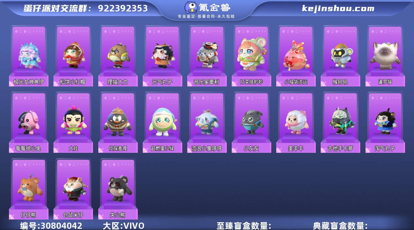 极光女神典伊小浮冰侦探麦嘎莓莓甜心兔元气丸子失心熊吉他手卡萝美羊羊小灰灰"性别:女 段位:三阶鸡蛋 等级:48 历史潮流:3.7万 紫色套装数量:22 紫色套装:莓莓甜心兔,元气丸子 ,失心熊 ,吉他手卡萝 ,超燃蛋小绿 ,大娃 ,侦探麦嘎 ,猴吼吼,打菜侠妙妙 ,音乐家蕾利 ,暹罗猫 ,小福袋添运 ,极光女神典伊 ,小浮冰 ,美羊羊 ,小灰灰 ,流浪小象哆哆 ,狸猫大力 ,仓鼠米仔 ,仔仔熊 ,松饼小红帽 ,淘气丸子 背饰:天马法杖 电极蝴蝶结 玩具:随行召唤器 鱼篓 2周年蛋糕"