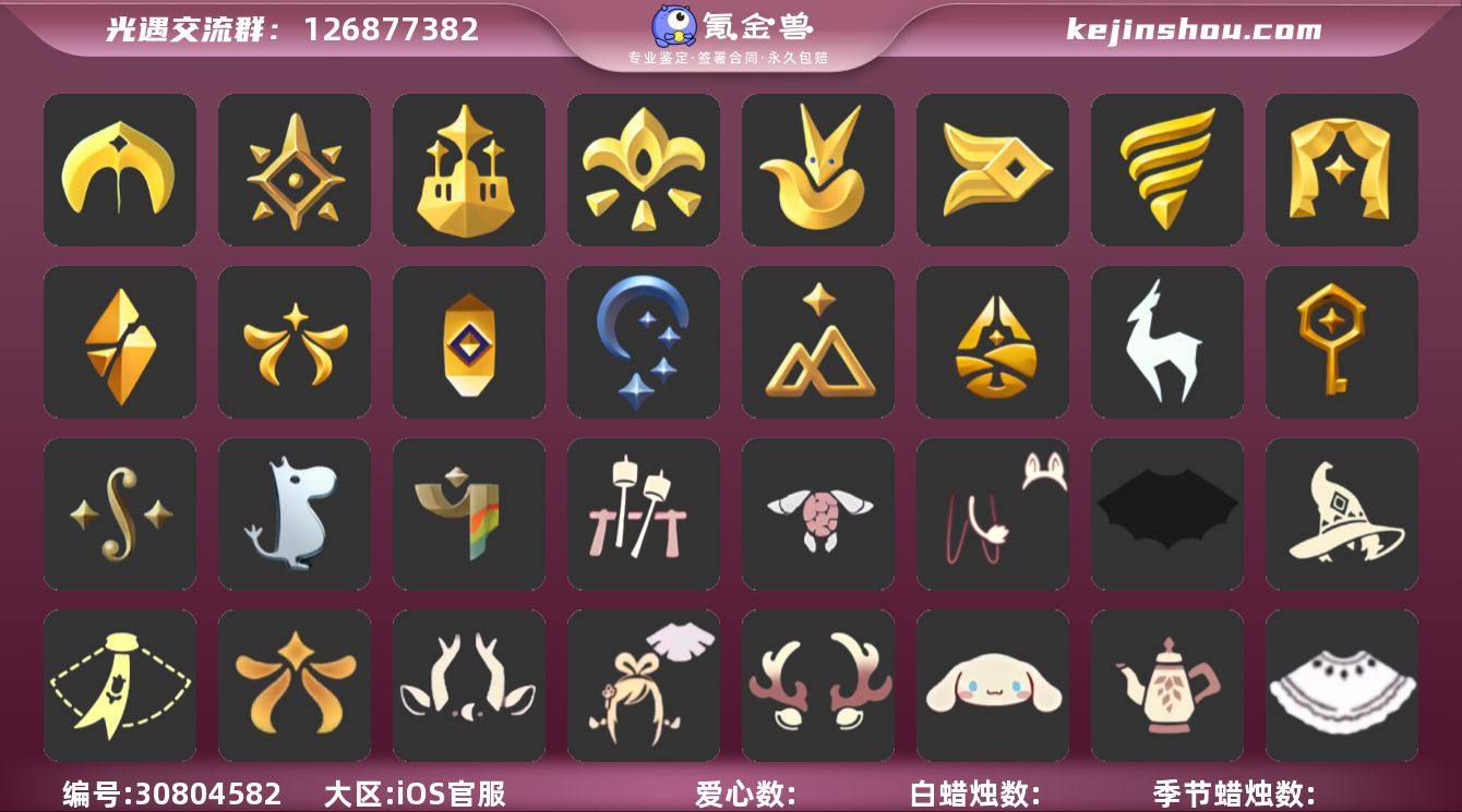 【编号Z7406】 蜡烛数量:337 爱心:181 翼数量:127 账号类型: 手机账号 季节已毕业: 圣岛季,预言季,梦想季,小王子季,风行季,潜海季,表演季,破晓季,欧若拉季,集结季,夜行季,追忆季,拾光季,归巢季,九色鹿季,筑巢季,二重奏季,姆明季,彩染季 完成地图: 晨岛,云野,雨林,霞谷,墓土,禁阁,全图毕业 珍稀物品: 阿努比斯(狗头),白枭,透明蝶翼斗,玫瑰花 礼包: 蝙蝠套,巫师,围巾,欧若拉之翼,九色鹿角,绊爱,鹿角,大耳狗发饰,茶壶,白绒金,女巫裙,福娃,小船,人声乐器,雪花球,橘子,贝壳,红伞,兔子,南瓜,枯角,雪花,鲤鱼,竖琴,tgc,猫套,猫背饰,星月头饰,彩虹耳钉,新年裤,四叶草,爱心眼镜,雪人鞋,姆明饰品套装,海龟斗篷,篝火点心礼包,冥龙南瓜 裤子: 武士裤,背带裤,白棉裤,搓澡巾 面具: 黄鼠狼,红狐狸,阿努比斯 面饰: 红耳机 项链: 围巾 发型: 蝴蝶结,正太,樱花,公主头,虚荣,猫耳 头饰: 花环 斗篷: 白金,红金,白鸟斗,花瓣斗篷,荧蓝斗篷 配饰: 雨伞,排箫,高音钢琴,吉他,笛子,大铃铛乐器,乐器 亮点: 重塑药水265,有彩染季季卡