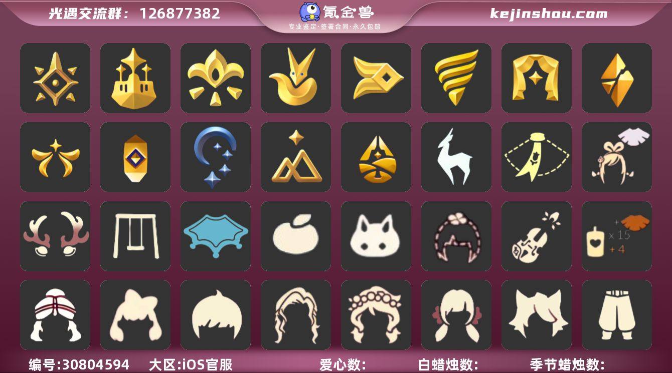 【编号Z7557】 蜡烛数量:493 爱心:170 翼数量:161 账号类型: 手机账号 季节已毕业: 预言季,梦想季,小王子季,风行季,潜海季,表演季,破晓季,欧若拉季,集结季,夜行季,追忆季,拾光季,归巢季,九色鹿季 完成地图: 晨岛,云野,雨林,霞谷,墓土,禁阁,全图毕业 珍稀物品: 阿努比斯(狗头),白枭,透明蝶翼斗,玫瑰花 礼包: 围巾,绊爱,鹿角,秋千,瑞雪,橘子,兔子,四叶草,小提琴,创始人 裤子: 武士裤,背带裤,白棉裤,搓澡巾 面具: 黄鼠狼,红狐狸,阿努比斯 面饰: 红耳机 项链: 围巾 发型: 蝴蝶结,正太,樱花,公主头,虚荣,猫耳 头饰: 花环 斗篷: 白金,红金,白鸟斗,花瓣斗篷,荧蓝斗篷 配饰: 雨伞,排箫,高音钢琴,吉他,笛子,大铃铛乐器,乐器 亮点: 重塑药水87