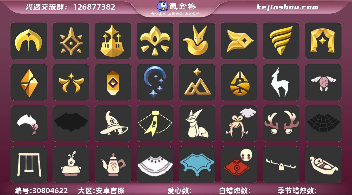 账号类型: 手机账号 季节已毕业: 圣岛季,预言季,梦想季,小王子季,风行季,潜海季,表演季,破晓季,欧若拉季,集结季,夜行季,追忆季,拾光季,归巢季,九色鹿季 完成地图: 晨岛,云野,雨林,霞谷,暮土,禁阁,全图毕业 珍稀物品: 阿努比斯(狗头),白枭,透明蝶翼斗,玫瑰花 礼包: 蝙蝠套,巫师,围巾,小狐狸,绊爱,鹿角,蜘蛛斗,秋千,茶桌,茶壶,白绒金,瑞雪,福娃,跷跷板,小船,鲤鱼套,彩虹帽,雪花球,绒帽,橘子,粽叶,贝壳,红伞,兔子,南瓜,枯角,雪花,鲤鱼,竖琴,tgc,星月头饰,彩虹耳钉,新年裤,蝴蝶结,雪人鞋,创始人,蛛网朋克,海龟斗篷 裤子: 武士裤,背带裤,白棉裤,搓澡巾 面具: 黄鼠狼,红狐狸,阿努比斯 面饰: 红耳机 项链: 围巾 发型: 蝴蝶结,正太,樱花,公主头,虚荣,猫耳 头饰: 花环 斗篷: 白金,红金,白鸟斗,花瓣斗篷,荧蓝斗篷 配饰: 雨伞,排箫,高音钢琴,吉他,笛子,大铃铛乐器,乐器 亮点: 重塑药水30