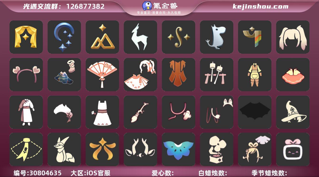 账号类型: 手机账号 季节已毕业: 表演季,夜行季,拾光季,九色鹿季,二重奏季,姆明季,彩染季 完成地图: 雨林,霞谷,暮土 珍稀物品: 白枭 礼包: 蝙蝠套,巫师,围巾,小狐狸,欧若拉之翼,九色鹿角,莲花斗,音乐桌,绊爱,大铁头,荷叶伞,蜘蛛斗,牛仔裤,兔子鞋,肯德基联动,运动鞋,秋千,茶桌,茶壶,白绒金,福娃,小船,吉他,灯笼,风之旅人,奔跑裤子,人声乐器,奔跑发型,彩虹帽,橘子,贝壳,黄伞,红伞,兔子,南瓜,枯角,鲤鱼,竖琴,手碟,tgc,水母,星月头饰,彩虹耳钉,彩虹耳机,新年裤,蝴蝶结,奥利奥,四叶草,暗彩装扮,向日葵套,小提琴,滑板,爱心眼镜,火焰眼镜,伯爵斗篷,透明蛛丝,伯爵面具,新年耳钉,龙纹斗,创始人,海蓝波浪发型,锦标赛短袍,锦标赛桂冠,姆明饰品套装,树精肩饰,恶作剧飞行扫帚,向日葵连衣裙,蛛网朋克,龙鳞束身长袍,妮妮斗篷,园丁装扮,衔福献瑞礼包,献瑞折扇礼包,渐变双马尾发型礼包,心心相印发饰礼包,篝火点心礼包,奉献斗篷,潮汐套装礼包 裤子: 武士裤,搓澡巾 面饰: 红耳机 项链: 围巾 发型: 正太,樱花,公主头,虚荣,猫耳 头饰: 花环 斗篷: 红金,白鸟斗,荧蓝斗篷,玫瑰褶边斗篷 配饰: 雨伞,高音钢琴,大铃铛乐器,乐器 亮点: 重塑药水180,有青鸟季季卡
