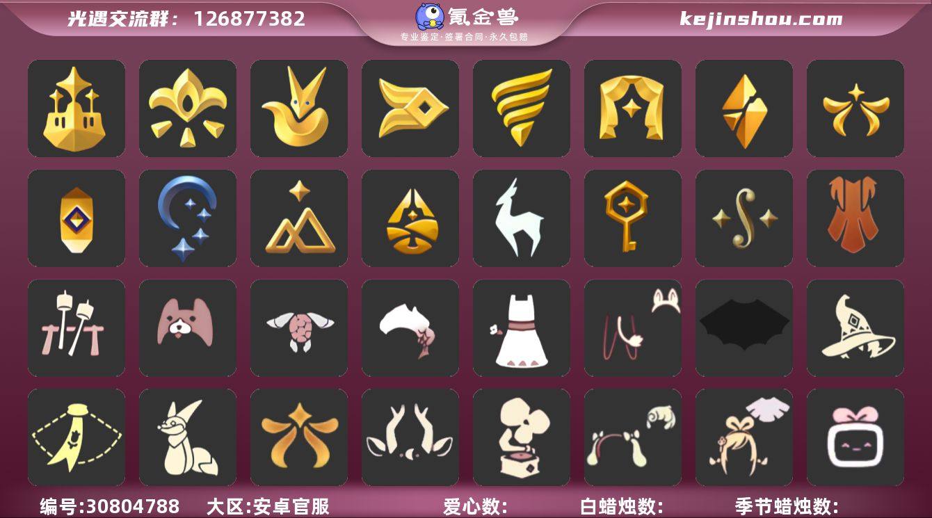 账号类型: 手机账号 季节已毕业: 梦想季,小王子季,风行季,潜海季,表演季,破晓季,欧若拉季,集结季,夜行季,追忆季,拾光季,归巢季,九色鹿季,筑巢季,二重奏季 完成地图: 晨岛,云野,雨林,霞谷,暮土,禁阁,全图毕业 珍稀物品: 白枭,透明蝶翼斗,玫瑰花 礼包: 蝙蝠套,巫师,围巾,小狐狸,欧若拉之翼,九色鹿角,音乐桌,大耳狗装扮,绊爱,大铁头,鹿角,荷叶伞,兔子鞋,大耳狗发饰,运动鞋,秋千,茶桌,茶壶,白绒金,瑞雪,福娃,跷跷板,小船,吉他,灯笼,风之旅人,奔跑裤子,人声乐器,奔跑发型,彩虹帽,雪花球,绒帽,橘子,贝壳,黄伞,红伞,兔子,南瓜,枯角,雪花,鲤鱼,竖琴,手碟,水母,猫套,猫背饰,星月头饰,彩虹耳钉,彩虹耳机,雪怪斗,新年裤,蝴蝶结,魔法棒,奥利奥,海螺,四叶草,暗彩装扮,向日葵套,小提琴,拖鞋,滑板,爱心眼镜,火焰眼镜,伯爵斗篷,透明蛛丝,伯爵面具,新年耳钉,创始人,海蓝波浪发型,飞鸟纸伞,彩虹泡泡机,日光耳环,遥鲲披肩斗篷,线框斗,姆明饰品套装,向日葵连衣裙,蛛网朋克,海龟斗篷,小狗周年发饰,篝火点心礼包,奉献斗篷 裤子: 武士裤,背带裤,白棉裤,搓澡巾 面具: 黄鼠狼,红狐狸 面饰: 红耳机 项链: 围巾 发型: 蝴蝶结,正太,樱花,公主头,虚荣,猫耳 头饰: 花环 斗篷: 白金,红金,白鸟斗,花瓣斗篷,荧蓝...