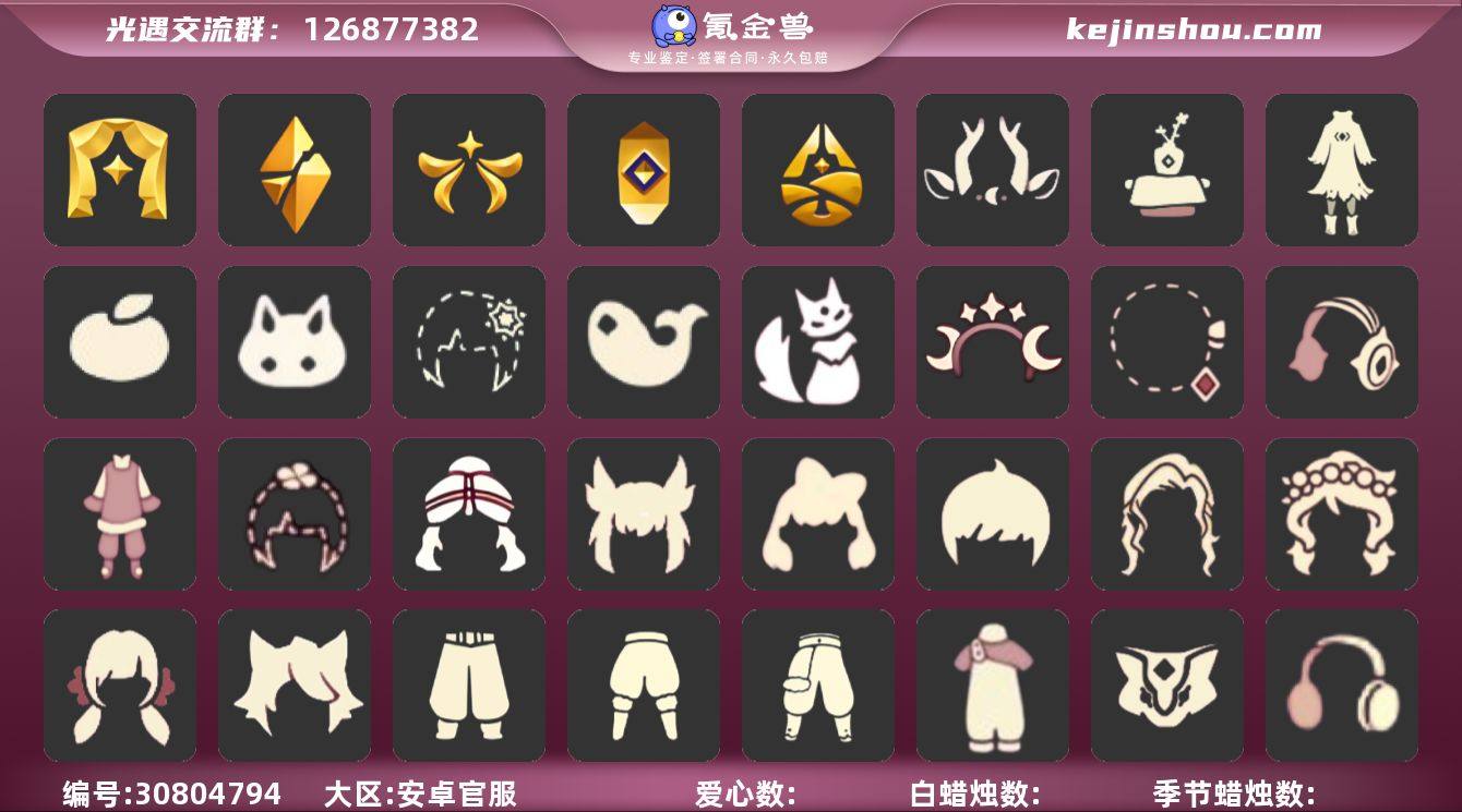 账号类型: 手机账号 季节已毕业: 破晓季,欧若拉季,夜行季,追忆季,拾光季,归巢季,九色鹿季,二重奏季,姆明季,彩染季,青鸟季,双星季,迁徙季 珍稀物品: 透明蝶翼斗,彩虹围巾 礼包: 蝙蝠套,巫师,欧若拉之翼,鹿角,秋千,福娃,人声乐器,橘子,红伞,南瓜,枯角,星月头饰,彩虹耳钉,彩虹耳机,四叶草,创始人,奉献斗篷,青衫落拓礼包 裤子: 武士裤,妮妮裙子,蓝绿裤,筑巢季·裤子 面具: 夜行毕业面具,辉光羚羊面具 面饰: 红耳机,黑框眼镜,青鸟毕业面饰 项链: 围巾 发型: 归巢毕业发型,若笠,虚荣,留辫蘑菇头,飞天盘发 头饰: 牛仔帽,蓝色音乐会,平顶帽 斗篷: 海洋斗,绿芽,粉红绒毛斗篷,遥鲲斗篷,冥龙斗篷,彩染围巾斗篷,奉献斗篷,青鸟毕业斗篷 配饰: 雨伞,姆明抱枕,小红伞,相机,鲲灯 亮点: 【优质装备】:破晓季,透明蝶翼斗,欧若拉季(欧若拉),归巢毕业发型(五塑彩羽发),若笠(箬笠),武士裤,夜行季,追忆季,妮妮裙子(妮妮长裙),牛仔帽(西部帽),姆明抱枕,小红伞(姆明红伞)(姆明大伞),相机(季卡相机),拾光季,彩虹围巾(五塑彩带斗),归巢季,九色鹿(九色鹿季),蓝绿裤(高领舞服),围巾(肩带),二重奏季,姆明季,筑巢季·裤子(设计师长袍),夜行毕业面具(棕熊面具),黑框眼镜(粗框眼镜),留辫蘑菇头,粉红绒毛斗篷(绒毛斗篷),遥鲲斗篷(双翼遥鲲斗),冥龙斗篷,鲲灯(追忆之书),辉光羚羊面具,彩染季,飞天盘发(九色鹿丸子头),青鸟季,青鸟毕业面饰(青鸟面饰),青鸟毕业斗篷(青鸟斗篷),双星季,蝙蝠套(蝙蝠斗篷)(南瓜头),欧若拉之翼,福娃(福娃礼包)(春之日礼包)(铜钱斗),秋千(情人秋千),红耳机,鹿角(圣诞鹿角),人声乐器(欧若拉之声),红伞(瑞气纸伞),奉献斗篷,巫师(巫师帽),枯角(巫树犄角),彩虹耳机,星月头饰(星月头冠),创始人(创始人斗篷),青衫落拓礼包,彩虹耳钉(彩虹耳饰),南瓜(冥龙南瓜),橘子(大橘大利),四叶草(四叶草头饰)
