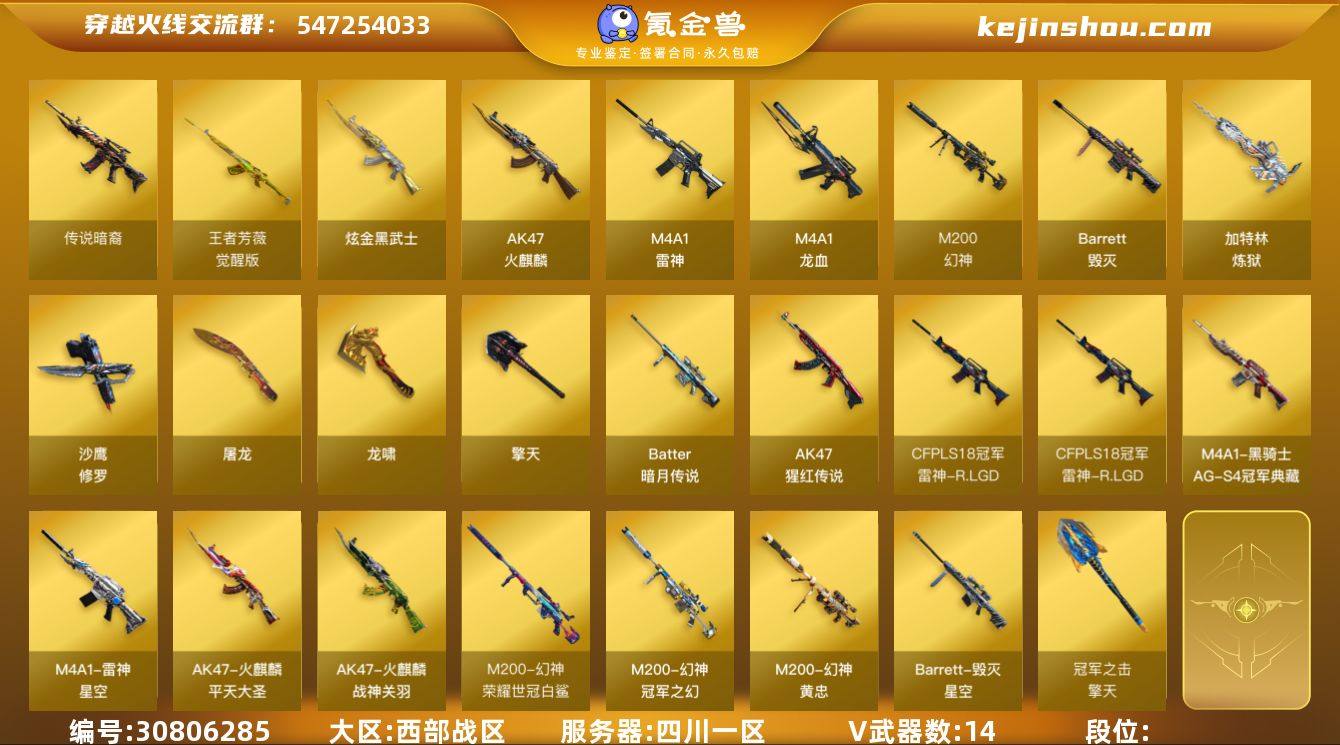 【CFYT52】40V/102级/荣耀元首/6王者/2英雄/幻神三件套/Scar Light-白虎/M200-幻神/死亡之眼/金刚伞/M200-幻神音效卡/M4A1-雷神音效卡/Barrett-碧霄极光音效卡/炼狱-百战金芒-庆典舞曲音效卡/幻神动感闪耀/幻神-荣耀世冠EP 皮肤/雷神-暗月/雷神冠军之魄/雷神-烈虎皮肤/M4A1-再燃火线/火麒麟-心动糖果/毁灭-冠军之怒/毁灭-CFPLS16皮肤/毁灭-英雄计划 皮肤/M4A1-千变-孔明皮肤/战神-粉色甜心皮肤/战神-紫绶金章皮肤/战神-流金岁月皮肤/AK47-B-常胜将军-曹操/AK47-B-常胜将军-刘备/AK47-B-常胜将军-孙权/轻型军用手斧-再燃火线/妮妮/零·纪元/奇洋探员/乔伊教练/修道士/云海玲珑/葵-阿尔法武装/暗夜-X/虎妞/嘉年华灵狐/娟娟/灵狐者-X/灵狐者-职业经理/龙儿/曼陀罗-X/潘多拉-X/斯沃特-X/蜀雪/铁骑荣耀/兔囡囡/AWM-灵狐-15周年嘉年华/迷你波特博士/迷你火种/迷你生化手雷/生化手雷-机甲核心/深渊终结者手雷/闪光弹-小乔/闪光弹-貂蝉/高爆手雷-大乔/迷你超能女侍/灵狐娃娃手雷/AK47-冰龙粉碎者/冰龙粉碎者-白马银枪/激光毁灭者III-白马银枪/神圣爆裂者-末日/AK47-火麒麟/M4A1-雷神/M4A1-死神/QBZ03-天罚/M4A1-猎神/AK47-B-战神/王者火魄-觉醒版/AK47-B-常胜将军/QBZ-03-王者蔷薇-觉醒版/Barrett-毁灭/炼狱-百战金芒/沙鹰-天神/柯尔特-荣耀世冠EP/屠龙/麒麟刺-百战金芒/王者之啸-觉醒版/高爆手雷-幻灵/高爆手雷-竞技荣光/高爆手雷-神工天巧/闪光弹-神工天巧/烟雾弹-竞技荣光/烟雾弹-荣耀世冠EP/M4A1-苍鸣雷神/AG战队炫彩背包/CFS限定背包/EP战队炫彩背包/百战金芒炫彩背包/超级背包/女皇终结者-魔龙之吻/救世主-黑桃战神/绿色巨人/灵魂忍者/变异宝贝/妖姬/迷雾幽灵/夺命之镰/防化服/金色流光-枪王排位/星辰流光-枪王排位/流光-鎏金之域/流光-再燃火线/枪王排位28赛季金色流光/语音特效-盛典烟火/萌萌小葵表情/电玩兔兔表情...
