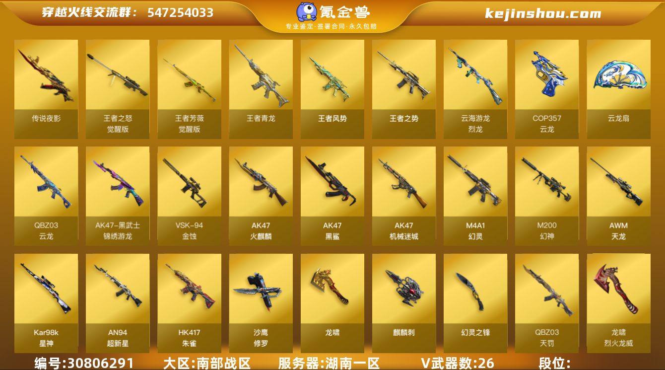 湖南一区 可二次 M200-幻神 (电流骇客) Kar98K-星神 (破竹) 传说夜影 VSK-94-金蚀 王者芳薇觉醒版 QBZ03-云龙 QBZ-03-天罚 HK417-朱雀 王者之怒觉醒版 AWM-天龙 M4A1-幻灵 AK47-火麒麟 无影神兵利器 黑武士-锦绣游龙 AK47-黑鲨 AK47-机械迷城 AN94-超新星 烈龙-云海游龙 黑龙吞噬者 雷神小红 Cat-刀锋 牛牛-AK47 黄金AK 高爆手雷-云龙 闪光弹-云龙 烟雾弹-云龙 手雷-云海游龙 手雷-热带奇洋 高爆手雷神工天巧 闪光弹神工天巧 烟雾弹神工天巧 闪光弹幻灵 烟雾弹幻灵 【王者武器】 王者之势 王者青龙 王者风势 【副武器类型】 COP357-云龙 COP白鲨 沙鹰-修罗 Cfcolt1911大黄蜂 【近身武器类型】 云龙扇 幻灵之锋 屠龙秘银 屠龙-云海游龙 龙啸 麒麟刺 *2 擎天-云海游龙 海神三叉戟 龙啸-烈火龙威 街机小灰机 【稀有角色】 雨墨 机械姬 王者-迷迭香 (4防) 王者影豹 (4防) 王者炫 (4防) 木兰 奇洋探员 云海玲珑 兰新年限定 麻雀 潘多拉X 堕天使 复仇者 闪光护目镜 超级对讲机 超级背包 【武器皮肤及道具】 幻神-电流骇客 星神-破竹 火麒麟-心动糖果 火麒麟-CFSTAR 火麒麟-平天大圣 天龙-能量核心 QBZ03-天罚音效卡 【稀有套装】 云龙套 PX_1460911