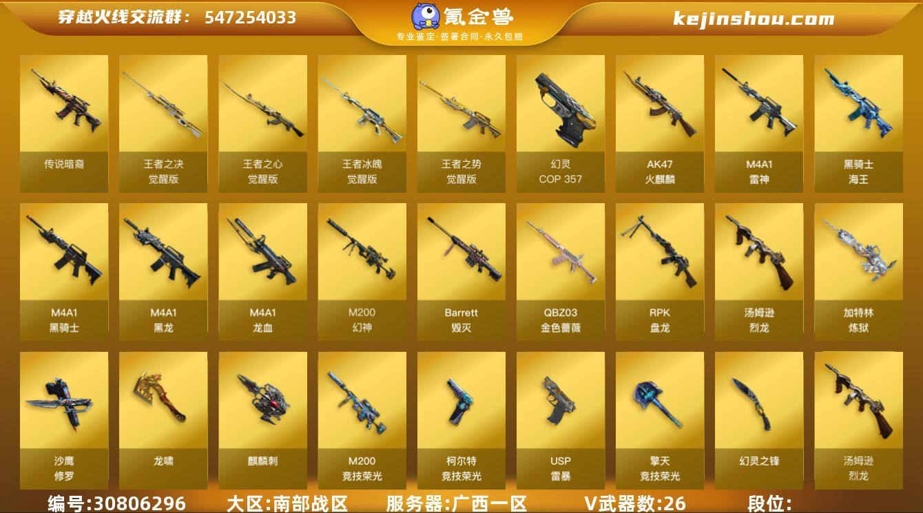 广西一区 可二次 55v M200-幻神 (宠儿+冠军之幻+冠军之刃) 传说暗裔 6烈龙+蝴蝶 4盘龙+2炼狱 (电子连击) M200-竞技荣光 Barrett-毁灭 王者之决觉醒版 王者冰魄觉醒版 M4A1-雷神 (N9+音效卡) QBZ03-金色蔷薇 (冠军之薇) M4A1-黑龙 王者之势觉醒版 M4A1-黑骑士 M4A1-龙血 *3 王者之心觉醒版 AK47-火麒麟 (传奇EVEN) 无影神兵利器 汤姆逊-烈龙 *6 6烈龙 斯泰尔-蝴蝶 RPK-盘龙 *4 加特林-炼狱 *2 炼狱-迷你小钢 黑骑士海王 M4小黄鸡 黄金AK 高爆手雷竞技荣光 *2 闪光弹竞技荣光 *2 烟雾弹竞技荣光 *2 高爆手雷幻灵 *3 闪光弹幻灵 *2 迷你生化手雷 【王者武器】 【副武器类型】 USP雷暴 柯尔特-竞技荣光 COP白鲨 COP-幻灵 沙鹰-修罗 *2 Colt1911小故障 【近身武器类型】 Knife-冠军之刃 幻灵之锋 龙啸 *2 麒麟刺 擎天-竞技荣光 龙啸-烈火龙威 金刚伞 夺魂 【稀有角色】 鹰 电竞教官-云悠悠 (四防) 王者春 (四防) 王者潘多拉 (四防) 王者凌霄 (四防) 空 职业选手 葵 木兰 修道士 麻雀 龙儿-小淘气 潘多拉X 影武者X 暗夜X 新娜塔莎 堕天使 复仇者 闪光护目镜 超级对讲机 超级背包 炫彩背包 【武器皮肤及道具】 幻神-宠儿-2021MVP 幻神-冠军之幻 QBZ03-冠军之薇 雷神耀金 雷神-传奇N9 雷神-虎将 AK47-火麒麟-传奇EVEN 火麒麟-冠军之心 火麒麟-AG 毁灭-风暴 M4A1-黑龙-361 炼狱-电子连击 M4A1-千变-孔明 修罗-星空 雷神音效卡 【稀有套装】 竞技荣光套 PX_1398534