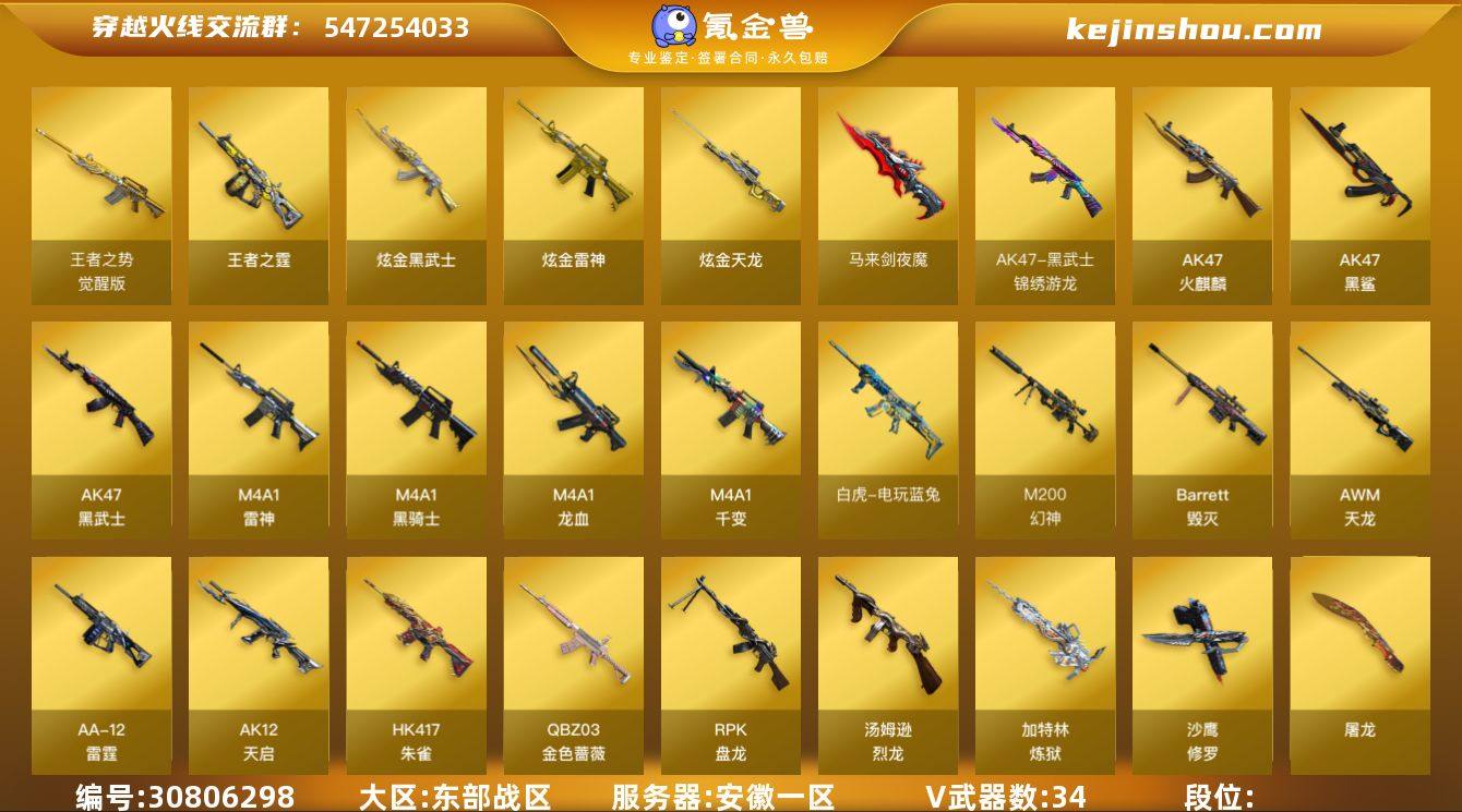 安徽一区 可二次 75v M200-幻神 星神-炽天使 USP-神工天巧 白虎电玩蓝兔 HK417-朱雀 Barrett-毁灭 (耀金+音效卡) M4A1-雷神 (冠军之魄+赵云) QBZ03-金色蔷薇 (冠军之薇+音效卡) 王者之势觉醒版 M4A1-黑骑士 (马超+音效卡) M4A1-千变 M4A1-龙血 *2 AK47-火麒麟 *6 无影神兵利器 AK47-黑武士 *2 黑武士-锦绣游龙 AK47-黑鲨 AK12-天启 烈火动感闪耀 汤姆逊-烈龙 *4 RPK-盘龙 加特林-炼狱 王者之霆觉醒版 AA-12-雷霆 *3 AWM-天龙 *2 炫金雷神 炫金武士 炫金天龙 金色小号 AK常胜将军 黄金AK 闪光弹雷霆王者觉醒版 *2 烟雾弹雷霆王者觉醒版 *2 高爆手雷神工天巧 闪光弹神工天巧 *3 烟雾弹神工天巧 高爆手雷夜魔 闪光弹夜魔 烟雾弹夜魔 动感闪耀手雷 手雷-热带奇洋 迷你生化手雷 【王者武器】 高爆手雷雷霆王者 *3 【副武器类型】 USP-神工天巧 沙鹰-修罗 *5 天神动感闪耀 Colt1911小故障 【近身武器类型】 屠龙 *3 屠龙秘银 屠龙动感闪耀 龙啸 *2 麒麟刺 擎天 马来剑-夜魔 荣耀之证 龙啸-烈火龙威 金刚伞电玩红兔 军用手斧镜 夺魂 【稀有角色】 王者-瞳-闭月羞花 (4防) 女主播 (4防) 灵动武士 职业选手 魅影 奇洋探员 乔伊教练 麻雀 黄金海岸 影武者X 暗夜X 铁骑荣耀 新娜塔莎 幻影 堕天使 复仇者 超级护目镜 闪光护目镜 超级背包 【武器皮肤及道具】 QBZ03-冠军之薇 雷神-冠军之魄 M4A1-战神赵云 雷神-暗月 火麒麟-心动糖果 毁灭-墨兰 毁灭-直播专属 毁灭耀金 黑骑士-战神马超 修罗-CFSTAR 毁灭音效卡 火麒麟音效卡 黑骑士音效卡 QBZ03-金色蔷薇音效卡 PX_1984630