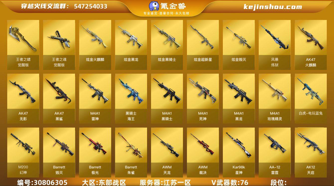 76V/100级/元帅/3王者/5炫金/2英雄/QBZ03-金色蔷薇/M200-幻神/死亡之眼/白虎-电玩蓝兔/Kar98k-星神/M4A1-黑骑士/汤姆逊-烈龙/RPK-盘龙/加特林-炼狱/沙鹰-修罗/炫金火麒麟/炫金黑骑士/炫金黑龙/炫金超新星/炫金毁灭/AK47-火麒麟音效卡/M4A1-黑龙音效卡/M4A1-黑骑士音效卡/Barrett-毁灭音效卡/幻神冠军之幻/烈龙-星空/雷神-耀金皮肤/雷神-烈虎皮肤/火麒麟-雷神/火麒麟-华夏之心/火麒麟-平天大圣/毁灭-冠军之怒/毁灭-黑大圣皮肤/毁灭-风暴/M4A1-千变-孔明皮肤/黑龙-能量核心/黑骑士-暗月/无影-暗月/死神-秘银/战神-粉色甜心皮肤/战神-紫绶金章皮肤/战神-流金岁月皮肤/AK47-B-常胜将军-曹操/AK47-B-常胜将军-刘备/AK47-B-常胜将军-孙权/天龙-能量核心/炼狱-星空/修罗-能量核心/葵/鹰/王者-瞳-闭月羞花/修道士/初恋灵狐/风暴女/虎妞/嘉年华灵狐/兰-新年限定/0号玩家/灵狐者-X/灵狐者-黄金海岸/龙儿/麻雀/潘多拉-X/潘多拉-甜心教官/潜龙队-X/青霞仙子/蜀雪/雪莉杨/影武者-X/职业选手/天龙-曼陀罗/火麒麟-灵狐/M4A1-雷神-精英刀锋/AWM-灵狐-15周年嘉年华/海滩汪汪-巴雷特/迷你深渊冰龙/迷你裂空之翼/夺魂/迷你牛牛/迷你生化手雷/生化手雷-机甲核心/深渊终结者手雷/闪光弹-小乔/闪光弹-貂蝉/高爆手雷-大乔/迷你艾比/迷你超能女侍/灵狐娃娃手雷/超级对讲机/6烈龙/5盘龙/致命乱世-超越/冰龙粉碎者-白马银枪/激光毁灭者/神圣爆裂者-末日/AK47-火麒麟/M4A1-黑龙/M4A1-雷神/AK47-无影/M4A1-死神/AK12-天启/AN94-超新星/AK47-黑鲨/M4A1-玫瑰精灵/AK-47-猩红传说/AK47-B-战神/黑骑士-海王/AK47-B-常胜将军/AWM-天龙/Barrett-毁灭/Barrett-极光/AWM-裁决/Barrett-朱雀/炼狱-风暴/AA-12-雷霆/沙鹰-天神/王者之魂-觉醒版/屠龙/龙啸/马来剑夜魔/擎天/麒麟刺/擎天-竞技荣光/王者之啸-觉醒版/高爆手雷-雷霆/高爆手雷-夜魔/高爆手雷-竞技...