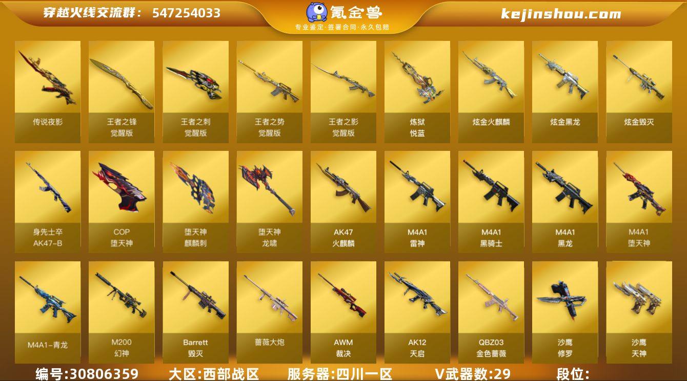 四川一区 可二次 63v M200-幻神 (世冠白鲨+周瑜) 传说夜影 Barrett-毁灭 (冠军之怒+音效卡) AWM-裁决 M4A1-雷神 QBZ03-金色蔷薇 (音效卡) M4A1-黑龙 王者之势觉醒版 M4A1-黑骑士 M4A1-堕天神 M4A1-青龙 AK47-火麒麟 (枪娘+轻羽) 王者之影觉醒版 无影神兵利器 AK12-天启 炼狱悦蓝觉醒版 炫金火麒麟 炫金毁灭 炫金黑龙 巴雷特-零-水下丽影 AK常胜将军 AK身先士卒 AKB-战士 AK猩红传说 *2 Barrett暗月传说 Barrett金色蔷薇 QBZ03-吕布 高爆手雷堕天神 *7 闪光弹堕天神 *7 烟雾弹堕天神 *7 【王者武器】 【副武器类型】 COP-堕天神 *2 沙鹰-修罗 *2 沙鹰-天神 *2 Colt1911小故障 Cfcolt1911大黄蜂 【近身武器类型】 王者之锋觉醒版 *2 屠龙 *3 龙啸-堕天神 王者之刺觉醒版 麒麟刺-堕天神 *2 擎天 龙啸-烈火龙威 【稀有角色】 王者春 (4防) 王者-瞳-闭月羞花 迷迭香 暗夜审判 (4防) 职业选手 木兰 乔伊教练 麻雀 蜀雪 潘多拉X 新娜塔莎 复仇者 超级护目镜 闪光护目镜 超级对讲机 超级背包 【武器皮肤及道具】 M200-幻神-荣耀世冠白鲨 幻神-周瑜 雷神-暗月 火麒麟-心动糖果 火麒麟-CFSTAR 火麒麟-枪娘凯萨琳 毁灭-冠军之怒 天龙-CFSTAR 修罗-CFSTAR 毁灭音效卡 黑骑士音效卡 QBZ03-金色蔷薇音效卡 雷神音效卡 PX_1546728