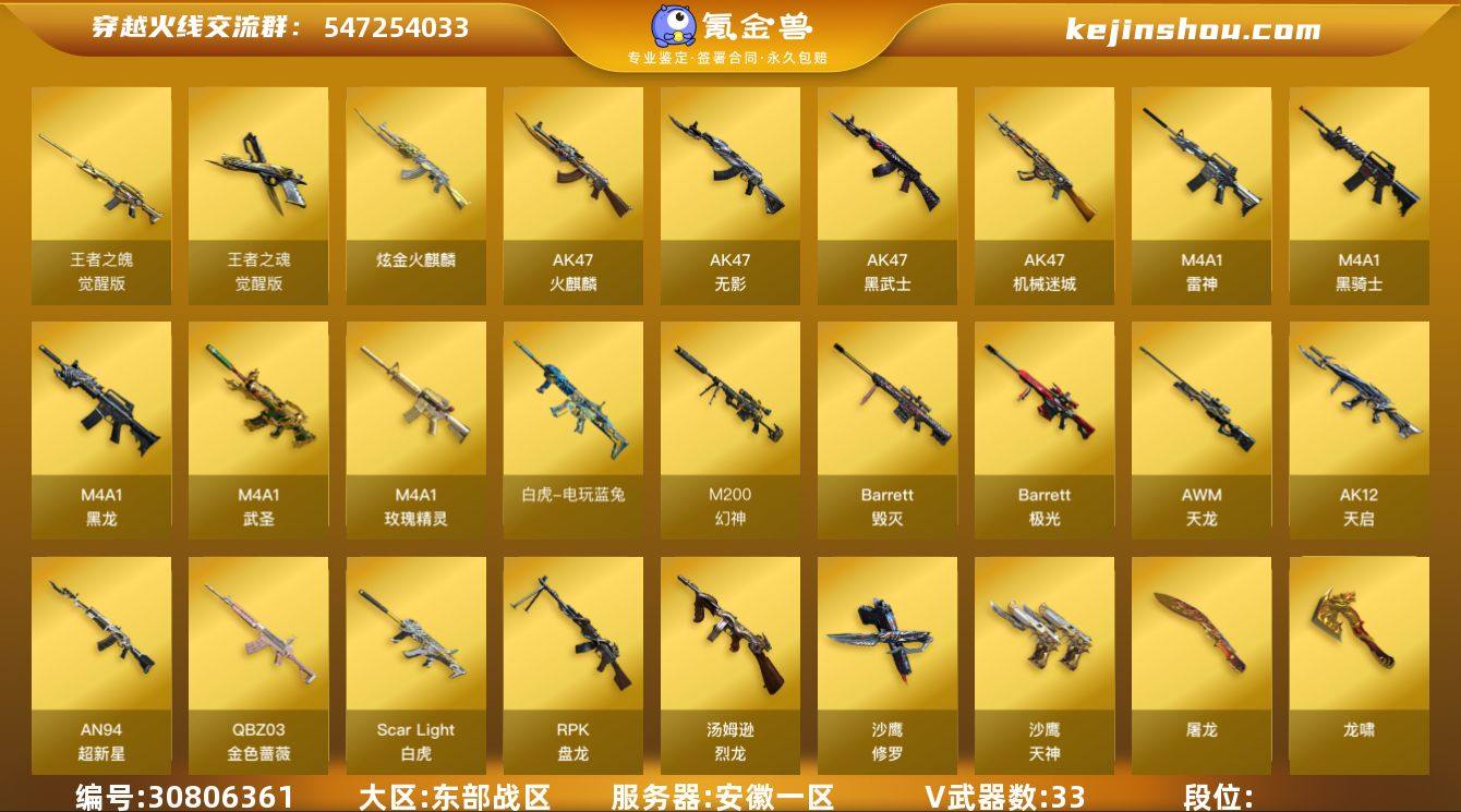 安徽一区 可二次 72V M200-幻神 (黄忠) 6烈龙 +死眼 柯尔特-冠军之特 冠军之刃 Scar-白虎 白虎电玩蓝兔 Barrett-毁灭 (音效卡) Barrett-极光 王者之魄觉醒版 M4A1-雷神 (冠军之魄+赵云+音效卡) QBZ03-金色蔷薇 (冠军之薇) M4A1-黑龙 M4A1-黑骑士 *3 M4A1-武圣 AK47-火麒麟 *3 AK47-无影 AK47-黑武士 AK47-机械迷城 AK12-天启 *2 AN94-超新星 *3 汤姆逊-烈龙 *6 RPK-盘龙 *3 AWM-天龙 炫金火麒麟 M37-葵 AK猩红传说 *3 M4A1-玫瑰精灵 死亡之眼 AK47-B十周年 高爆手雷雷霆 *2 闪光弹雷霆 *2 烟雾弹雷霆 *2 恶棍电竞装甲 闪光弹电竞装甲 烟雾弹电竞装甲 【王者武器】 【副武器类型】 柯尔特-冠军之特 王者之魂觉醒版 沙鹰-修罗 *6 沙鹰-天神 柯尔特-电竞装甲 Cfcolt1911大黄蜂 【近身武器类型】 Knife-冠军之刃 屠龙 尼泊尔-雷霆 屠龙秘银 龙啸 *3 麒麟刺 *2 擎天 *2 荣耀之证 金刚伞电玩红兔 【稀有角色】 王者-零-传说之路 职业选手 魅影 葵 樱 零 审判者 兔囡囡 王者樱-热浪之夏 麻雀 黄金海岸 潘多拉X 铁骑荣耀 幻影 堕天使 复仇者 闪光护目镜 超级对讲机 超级背包 炫彩背包 【武器皮肤及道具】 M200-幻神-黄忠皮肤 QBZ03-冠军之薇 雷神-冠军之魄 M4A1-战神赵云 雷神-源计划2.0 雷神-星空 雷神-能量核心 火麒麟-心动糖果 火麒麟-AG 毁灭-星空 黑骑士-战神马超 黑龙-能量核心 无影-能量核心 天龙-CFSTAR 毁灭音效卡 黑骑士音效卡 雷神音效卡 黑龙音效卡 绝迹语音包 PX_2119504