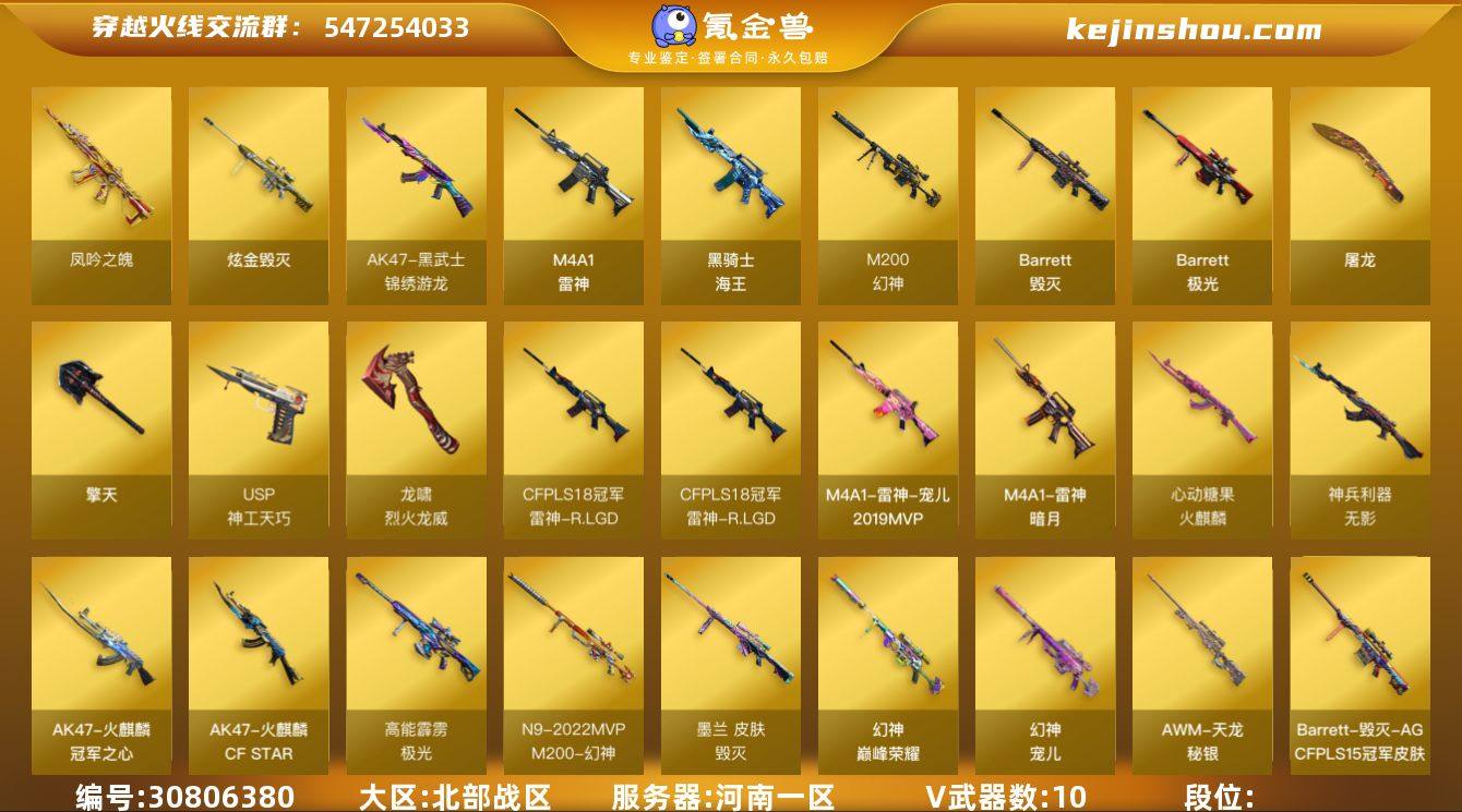 河南一区 可二次 M200-幻神 (宠儿+巅峰荣耀+N9-2022MVP) 凤吟之魄 Barrett-毁灭 (冠军AG+CFS2020) Barrett-极光 (高能霹雳) M4A1-雷神 (LGD+宠儿+音效卡) 无影神兵利器 黑武士-锦绣游龙 炫金毁灭 炼狱-迷你小钢 牛牛-AK47 黑骑士海王 AK47-B十周年 黄金AK 高爆手雷神工天巧 闪光弹神工天巧 *3 烟雾弹神工天巧 【王者武器】 凤吟之魄 【副武器类型】 USP-神工天巧 Colt1911小故障 【近身武器类型】 屠龙 擎天 猫猫手套 龙啸-烈火龙威 【稀有角色】 新海豹突击队 灵动武士 木兰 云海玲珑 兔囡囡 潘多拉X 暗夜X 铁骑荣耀 堕天使 闪光护目镜 超级对讲机 超级背包 【武器皮肤及道具】 幻神-宠儿-2021MVP M200-幻神-N9-2022MVP 幻神-巅峰荣耀 雷神-宠儿-2019MVP 雷神-R.LGD-CFPLS18冠军 雷神-暗月 火麒麟-心动糖果 火麒麟-CFSTAR 火麒麟-冠军之心 黑鲨-电流骇客 毁灭-AG-CFPLS15冠军 毁灭-墨兰 极光-高能霹雳 天龙-秘银 屠龙-荣耀之锋 擎天-冠军之击 麒麟刺-萌杀 雷神音效卡PX_1313345