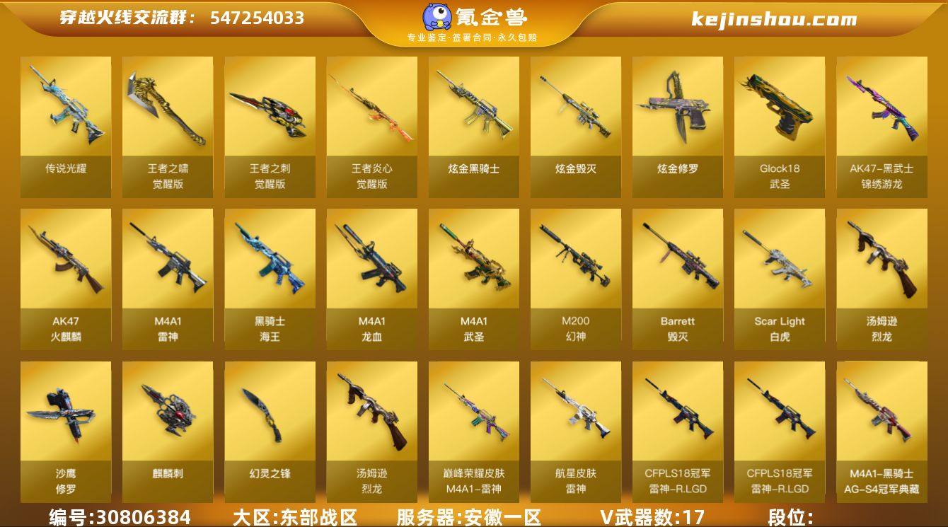 安徽一区 可二次 M200-幻神 (冠军之幻+纸灯笼+冠军之刃) 传说光耀 Scar-白虎 Barrett-毁灭 *2 (音效卡) M4A1-雷神 (巅峰荣耀+航星) M4A1-龙血 M4A1-武圣 王者炎心觉醒版 AK47-火麒麟 黑武士-锦绣游龙 汤姆逊-烈龙 炫金毁灭 炫金骑士 黑骑士海王 高爆手雷幻灵 闪光弹幻灵 烟雾弹幻灵 *2 【王者武器】 【副武器类型】 沙鹰-修罗 *3 Glock18-武圣 炫金修罗 Cfcolt1911大黄蜂 【近身武器类型】 Knife-冠军之刃 幻灵之锋 王者之啸觉醒版 王者之刺觉醒版 麒麟刺 【稀有角色】 王者潘多拉 隼 幽 卡塔琳娜 葵 雅典娜 幻影 堕天使 超级对讲机 特殊收纳包 【武器皮肤及道具】 幻神-冠军之幻 幻神-纸灯龙 雷神-巅峰荣耀 雷神-R.LGD-CFPLS18冠军 雷神-航星 火麒麟-平天大圣 黑骑士-AG-S4冠军典藏 毁灭音效卡 PX_1417522