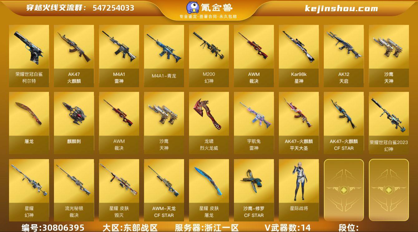 浙江一区 可二次 M200-幻神 (世冠2023白鲨+星耀) Kar98K-星神 (音效卡) 柯尔特-荣耀世冠白鲨2023 AWM-裁决 (流光秘银) M4A1-雷神 死神-雪域霜狐 M4A1-青龙 AK47-火麒麟 AK12-天启 黄金AK 闪光弹雷暴 【王者武器】 【副武器类型】 柯尔特-荣耀世冠白鲨2023 真的是手枪 沙鹰-天神 *4 Colt1911小故障 Cfcolt1911大黄蜂 【近身武器类型】 屠龙 *2 麒麟刺 荣耀之证 龙啸-烈火龙威 【稀有角色】 星际战将 木兰 0号玩家 兰新年限定 黄金海岸 蜀雪 潘多拉X 影武者X 暗夜X 幻影 堕天使 复仇者 透明头盔 闪光护目镜 超级对讲机 超级背包 【武器皮肤及道具】 幻神-荣耀世冠白鲨2023 幻神-星耀 雷神-宇航兔 火麒麟-CFSTAR 火麒麟-平天大圣 毁灭-星耀 裁决-流光秘银 天龙-CFSTAR 修罗-CFSTAR 屠龙-星耀 星神音效卡PX_2206875