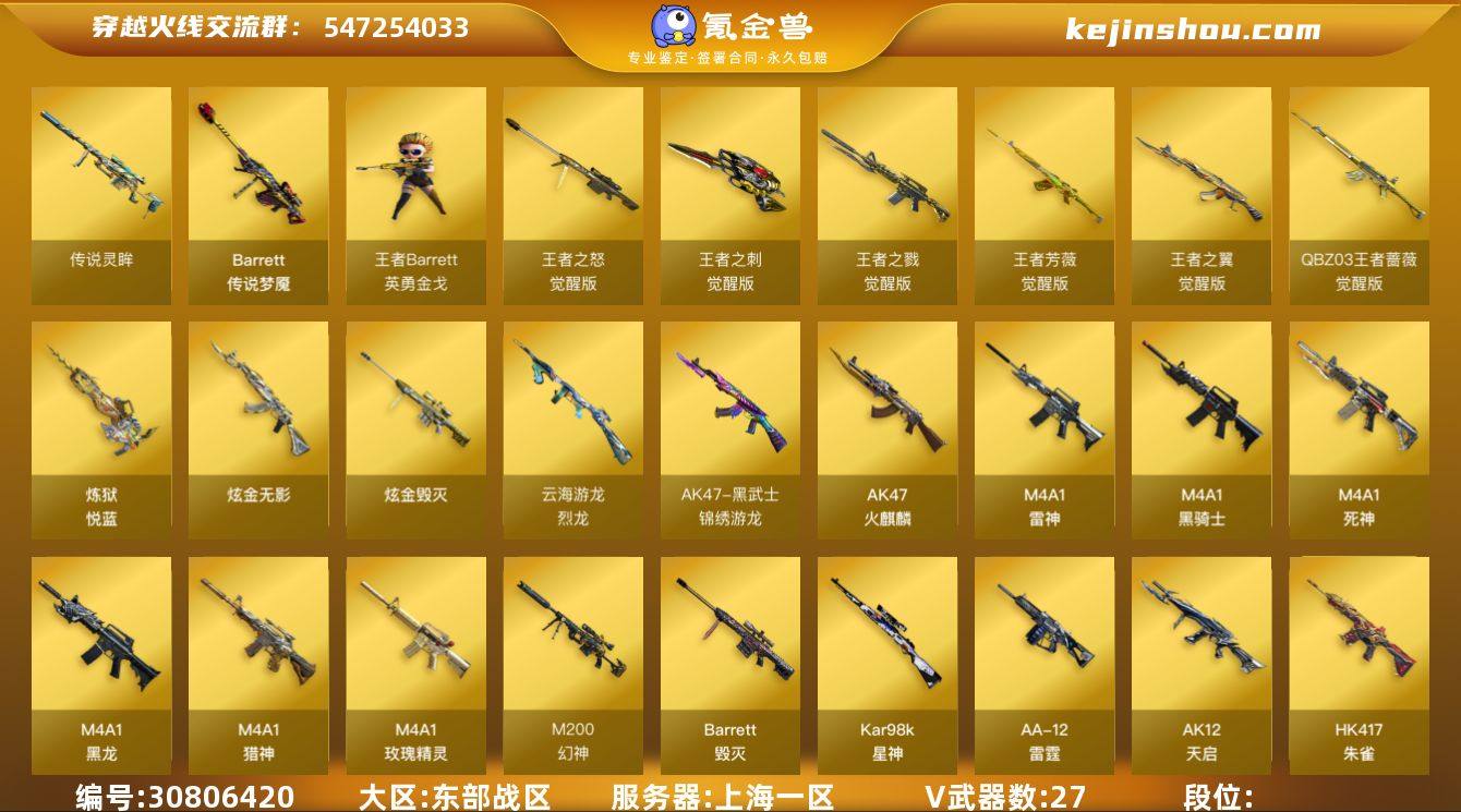 上海一区 可二次 57V11王者2传说 传说灵眸 M200-幻神 (冠军之幻+电流骇客+纸灯笼+Knife-冠军之刃) Kar98K-星神 (璀璨+音效卡) 传说梦魇 王者芳薇觉醒版 QBZ-03-王者蔷薇觉醒版 6黑骑士 HK417-朱雀 M14EBR-玄武 王者之怒觉醒版 Barrett-毁灭 M4A1-雷神 (LGD) QBZ03-金色蔷薇 (纸灯笼+巅峰荣耀) M4A1-黑龙 M4A1-黑骑士 *6 王者之戮觉醒版 M4A1-死神 M4A1-猎神 AK47-火麒麟 王者之翼觉醒版 黑武士-锦绣游龙 AK12-天启 斯泰尔-枪娘暗刃 烈龙-云海游龙 炼狱悦蓝觉醒版 AA-12-雷霆 *2 炫金毁灭 炫金无影 白虎-枪娘安妮 王者Barrett-英勇金戈 天龙-曼陀罗 金色小号 M4A1-玫瑰精灵 试炼破坏者 HK21-领域力场 AA12-擎天柱 爆炎激光超越Max 黄金AK 高爆手雷幻灵 *3 闪光弹幻灵 *3 烟雾弹幻灵 *3 手雷-云海游龙 【王者武器】 【副武器类型】 沙鹰-修罗 *3 Colt1911小故障 Cfcolt1911大黄蜂 【近身武器类型】 Knife-冠军之刃 屠龙 龙啸 王者之刺觉醒版 麒麟刺 擎天-云海游龙 龙啸-烈火龙威 夺魂 【稀有角色】 鹰 王者春 (4防) 关小雨 司雨 王者炫 (4防) 影豹 (4防) 王者涂鸦 (4防) 樱 审判者 云海玲珑 兔囡囡 麻雀 蜀雪 潘多拉X 影武者X 新娜塔莎 幻影 堕天使 复仇者 透明头盔 闪光护目镜 【武器皮肤及道具】 幻神-冠军之幻 幻神-电流骇客 幻神-纸灯龙 星神-璀璨 QBZ03-巅峰荣耀 QBZ03-纸灯龙 雷神-R.LGD-CFPLS18冠军 毁灭-墨兰 毁灭-云海游龙 黑骑士-AG-S4冠军典藏 黑龙-冠军之武 修罗-CFSTAR 龙啸-冠军之啸 星神音效卡 PX_2236690