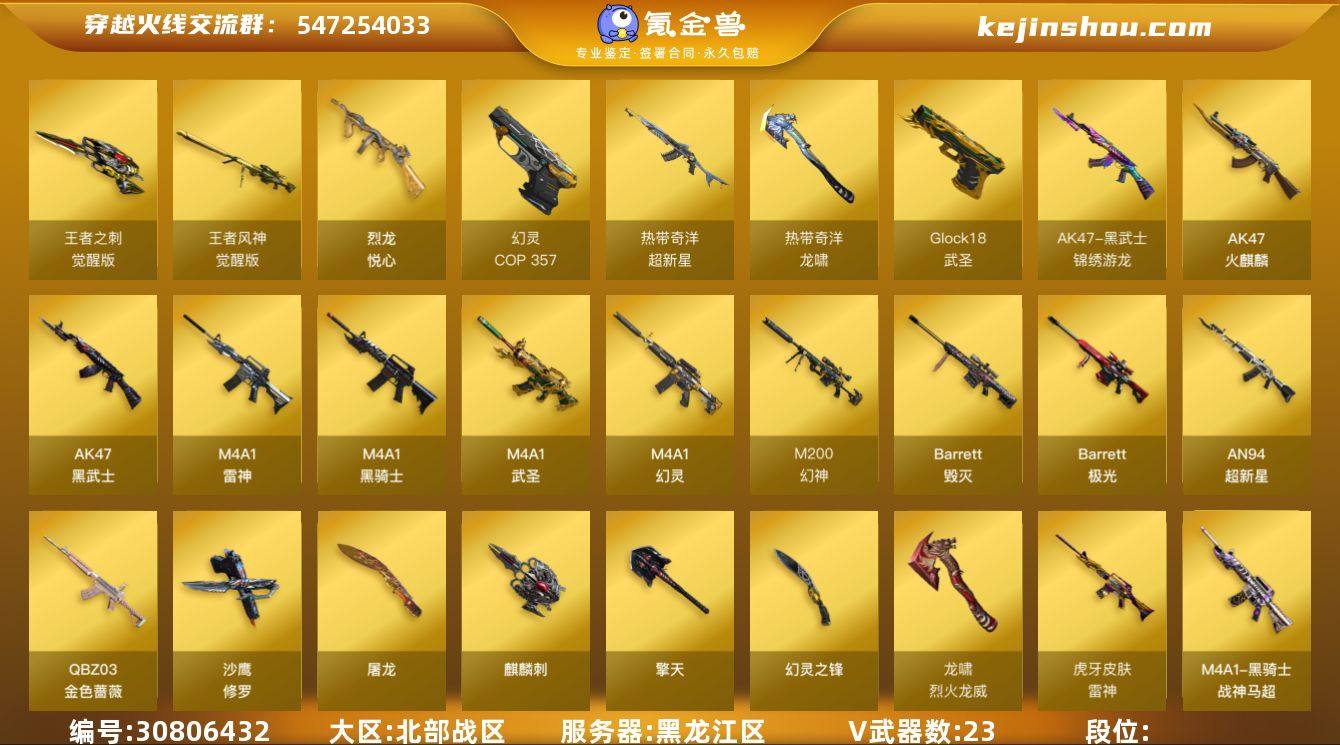 黑龙江 可二次 51v M200-幻神 (世冠白鲨+CFS2022) 王者风神觉醒版 Barrett-毁灭 (魔灵+冠军之怒) Barrett-极光 M4A1-雷神 (虎牙平台+荣耀之魄) QBZ03-金色蔷薇 (斗鱼平台) M4A1-黑骑士 *2 M4A1-幻灵 M4A1-武圣 AK47-火麒麟 (巅峰荣耀+世冠AG) AK47-黑武士 黑武士-锦绣游龙 AN94-超新星 超新星-热带奇洋 斯泰尔-枪娘暗刃 雷神小红 QBZ03-吕布 AK47-B十周年 黄金AK 手雷-热带奇洋 高爆手雷幻灵 *7 闪光弹幻灵 *7 烟雾弹幻灵 *7 【王者武器】 烈龙悦心 【副武器类型】 COP-幻灵 *2 沙鹰-修罗 Glock18-武圣 Colt1911小故障 Cfcolt1911大黄蜂 【近身武器类型】 黄金猫猫手套-白鲨 屠龙 幻灵之锋 龙啸-热带奇洋 王者之刺觉醒版 麒麟刺 擎天 荣耀之证 猫猫手套 龙啸-烈火龙威 夺魂 【稀有角色】 王者春 (4防) 隼 (4防) 影豹 (4防) 职业选手 奇洋探员 乔伊教练 麻雀 黄金海岸 龙儿-小淘气 潘多拉X 幻影 堕天使 复仇者 闪光护目镜 超级背包 【武器皮肤及道具】 幻神-CFS2022 M200-幻神-荣耀世冠白鲨 QBZ03-斗鱼 雷神-荣耀之魄 雷神-虎牙平台 火麒麟-巅峰荣耀 火麒麟-CFSTAR 火麒麟-荣耀世冠AG 毁灭-冠军之怒 毁灭-魔灵 黑骑士-战神马超 修罗-CFSTAR 屠龙-荣耀世冠AG 擎天-冠军之击 麒麟刺-荣耀世冠白鲨 N9语音包 PX_1465713