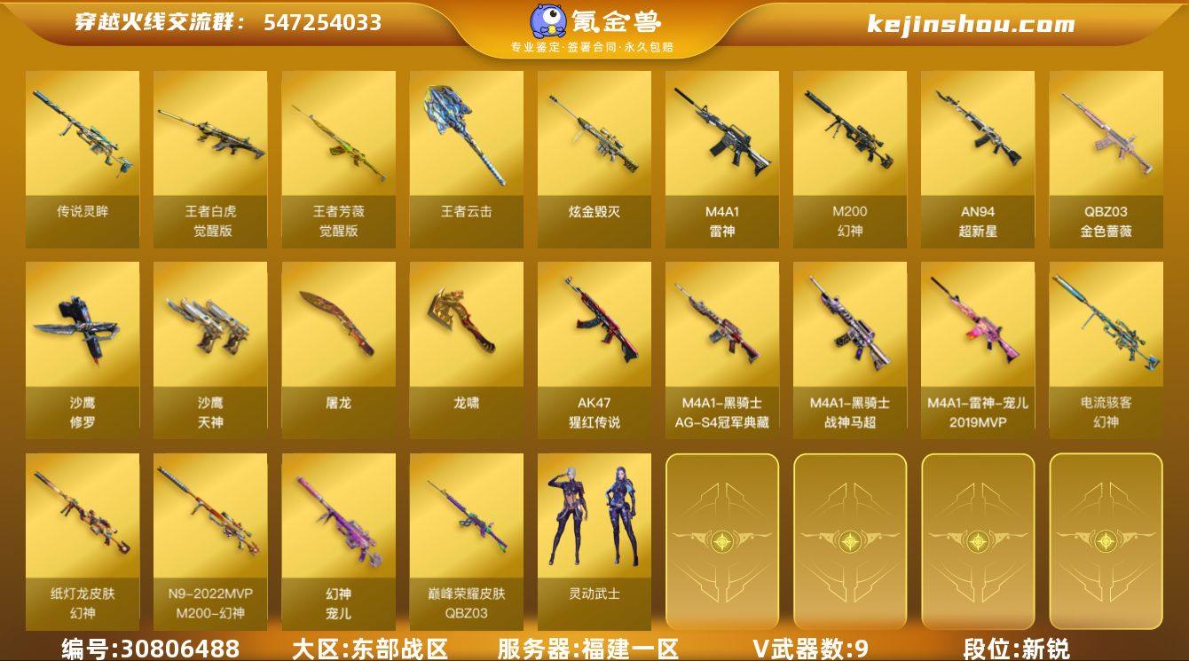 福建一区-9V-3王者-1炫金 【传说武器】:传说灵眸 【热门武器】:传说灵眸,QBZ03-金色蔷薇,M200-幻神,沙鹰-修罗 【王者炫金武器】:王者云击,炫金毁灭 【皮肤】:幻神-冠军之幻,幻神-宠儿-2021MVP,M200-幻神-N9-2022MVP,幻神-纸灯龙皮肤,幻神-电流骇客 皮肤,QBZ03-巅峰荣耀皮肤,雷神-宠儿-2019MVP,黑骑士-战神马超,黑骑士-AG-S4冠军典藏 【角色】:灵动武士,曼陀罗-X,潘多拉-X,潜龙队-X 【人偶武器】:白虎-迷你小艾 【英雄级武器】:M4A1-雷神,AN94-超新星,QBZ03-金色蔷薇,AK-47-猩红传说,王者白虎-觉醒版,王者芳薇-觉醒版,M200-幻神,沙鹰-修罗,沙鹰-天神,屠龙,龙啸 【道具】:超级背包,夺命之镰,防化服,金色流光-枪王排位,星辰流光-枪王排位,防弹头盔*2,防弹衣*2,C4工具钳,手雷包 【特殊枪械】:
