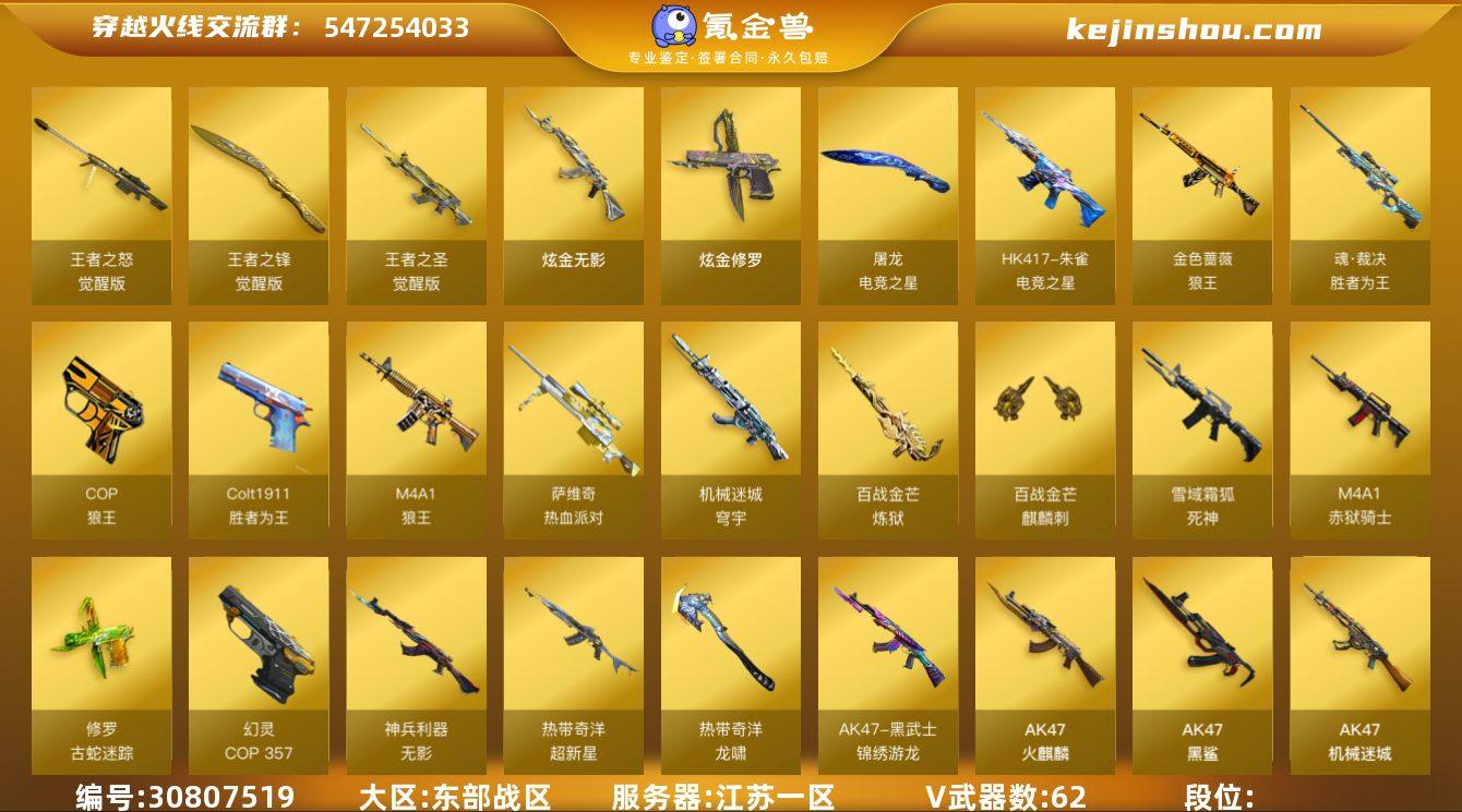 东部战区(江苏一区)ys【精品爆破号】62v【M200-幻神+双皮/电竞之星/动感闪耀,M200-竞技荣光,热带奇洋套装,动感闪耀套装,QBZ03-金色蔷薇+音效卡,白虎-电玩蓝兔,AWM-裁决,5烈龙+异变清道夫,COP357-幻灵】3王者【王者之圣,王者之怒,王者之锋】3炫金【炫金无影,炫金修罗】12角色【王者零-华冠丽服,王者樱-热浪之夏,葵,不败狙神,零-纪元,战地猎狐,幻面灵狐,葵-阿尔法武装,奇洋探员,乔伊教练,蛇隐宗,雪域霜狐,空】6音效【QBZ03-金色蔷薇音效卡,炼狱-百战金芒-庆典舞曲音效卡,M4A1-黑骑士音效卡,HK417-朱雀-电竞之星-竞星悦动音效卡,屠龙-电竞之星-竞星悦动音效卡,死神-雪域霜狐-怀旧音效卡】20皮【幻神-电竞之星,幻神-动感闪耀,星神-漫游,雷神-源计划2.0,黑骑士-耀金,毁灭-AG-CFPLS15冠军,火麒麟-雷神,火麒麟-心动糖果,雷神-荣耀之魄,雷神-神秘按键,毁灭-英雄计划,千变-孔明,修罗-CF STAR,火麒麟-CF STAR】VIP6截图展示段位不代表实际段位 如赛季更新等不可抗拒因素发生变化、时限道具不保证所剩时间